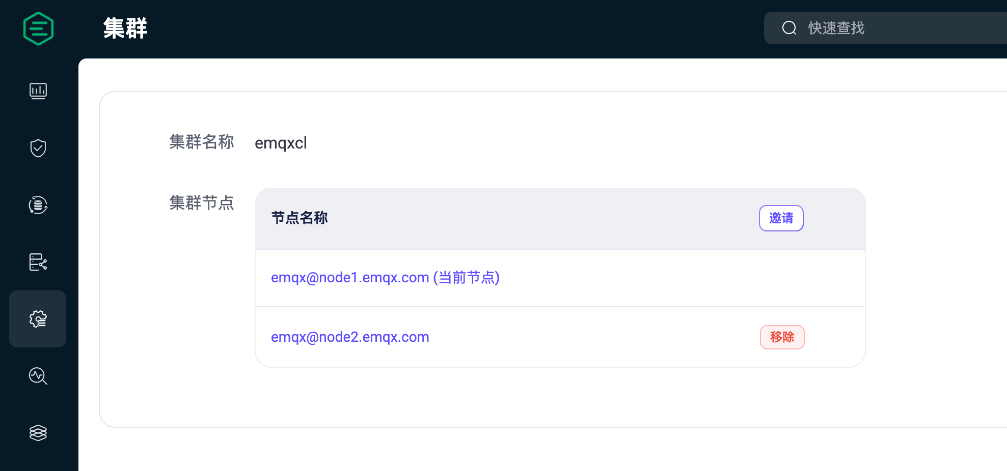 集群配置页面用于管理 EMQX 集群节点,您可以在此页面查看节点详情、邀请新节点以及移除已有节点。