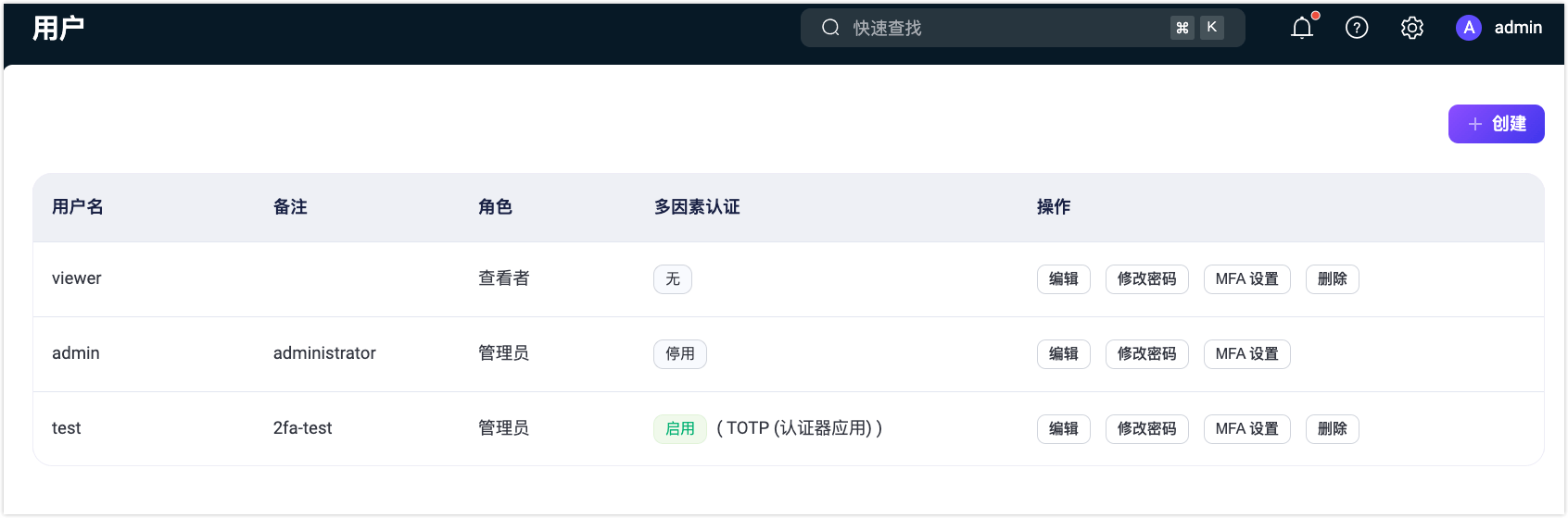 要添加新用户,只需点击页面右上角的创建按钮。一个弹出的对话框将提示您输入必要的用户详细信息。输入完毕后,点击创建按钮即可生成用户帐户。对于进一步的用户管理,如编辑用户信息、更新密码或删除用户,您可以通过操作列轻松访问这些选项。