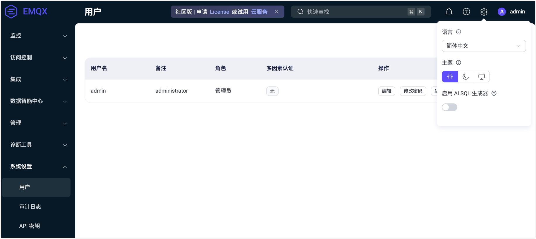 管理员拥有对 EMQX 所有功能和资源的完全管理访问权限,包括客户端管理、系统配置、API 密钥以及用户管理。