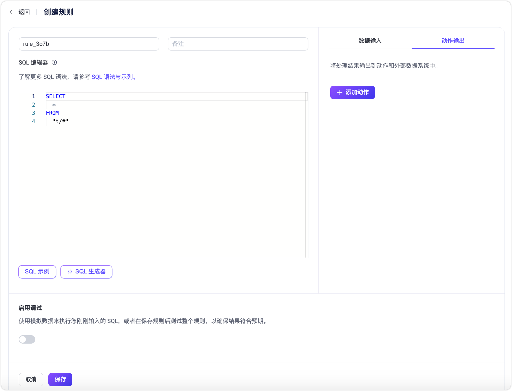 点击启用调试开关,并将测试目标选择为规则。注意,开始测试之前需要先保存规则。