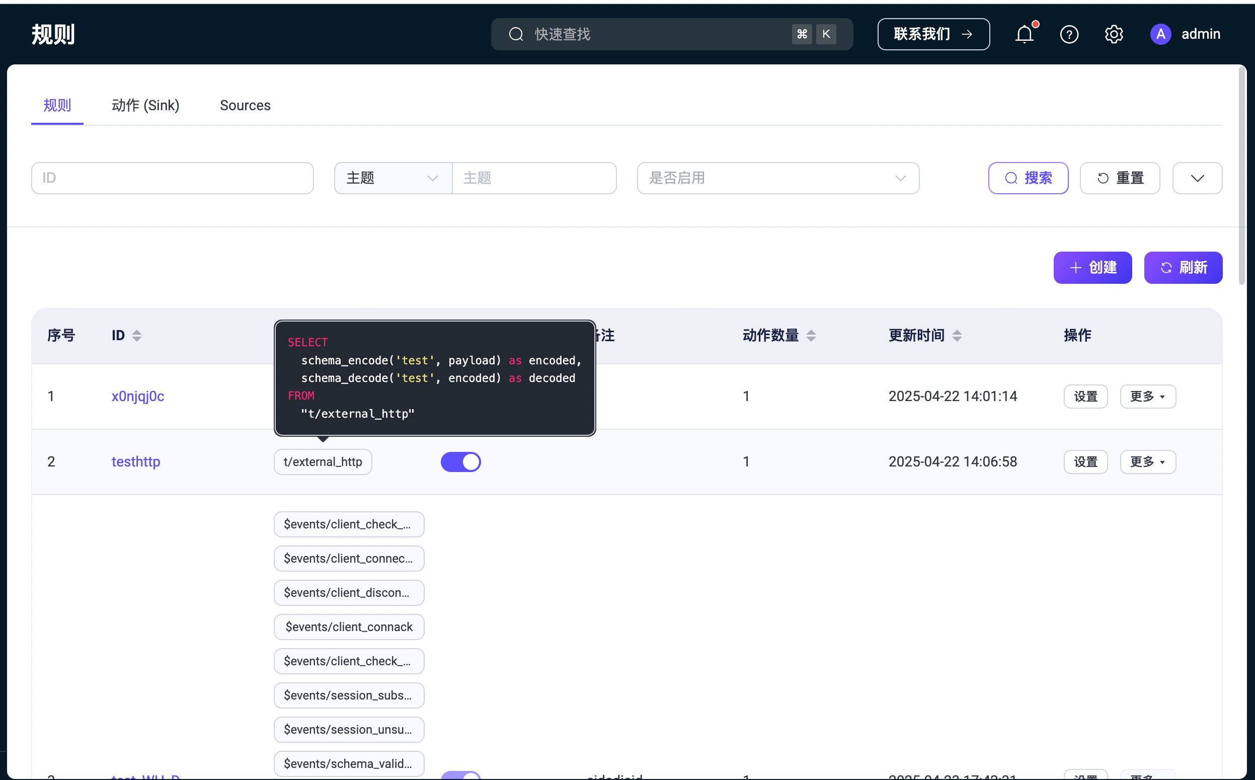 列表中的每个条目都会显示基本信息,包括规则 ID、关联的 Source、启用状态和动作数量。将鼠标悬停在 Source 上可查看对应的 SQL 语句详情。要修改规则的配置,请在操作列中点击设置。您还可以使用更多按钮来复制或删除规则。
