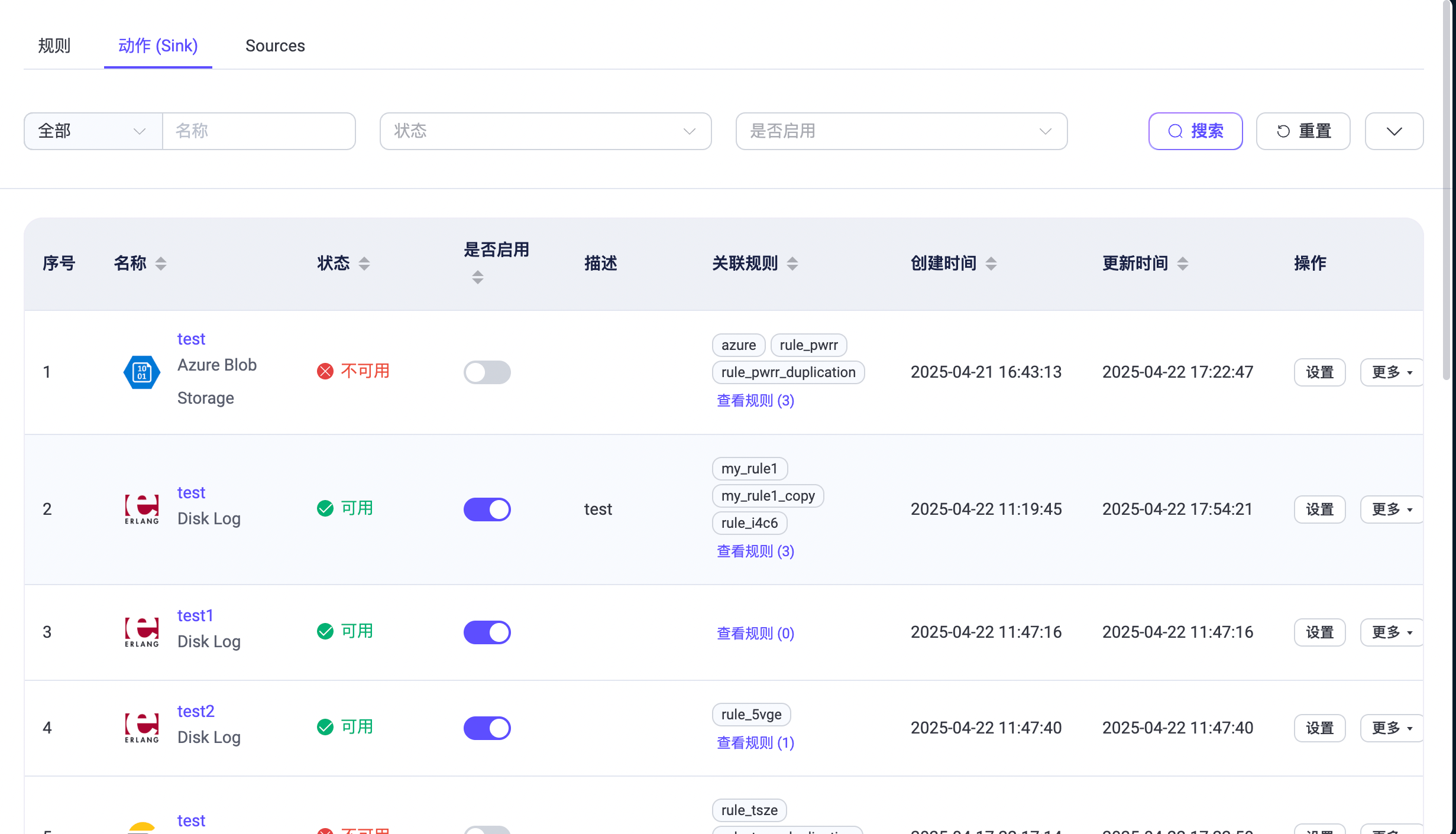 规则页面上的动作 (Sink) 和 Sources 标签页显示了所有创建的动作 (Sink) 和 Source。您可以查看基本信息,如名称、连接状态、关联的规则、启用状态以及创建和更新的时间等。通过点击列标题旁的箭头您可以对条目进行排序。