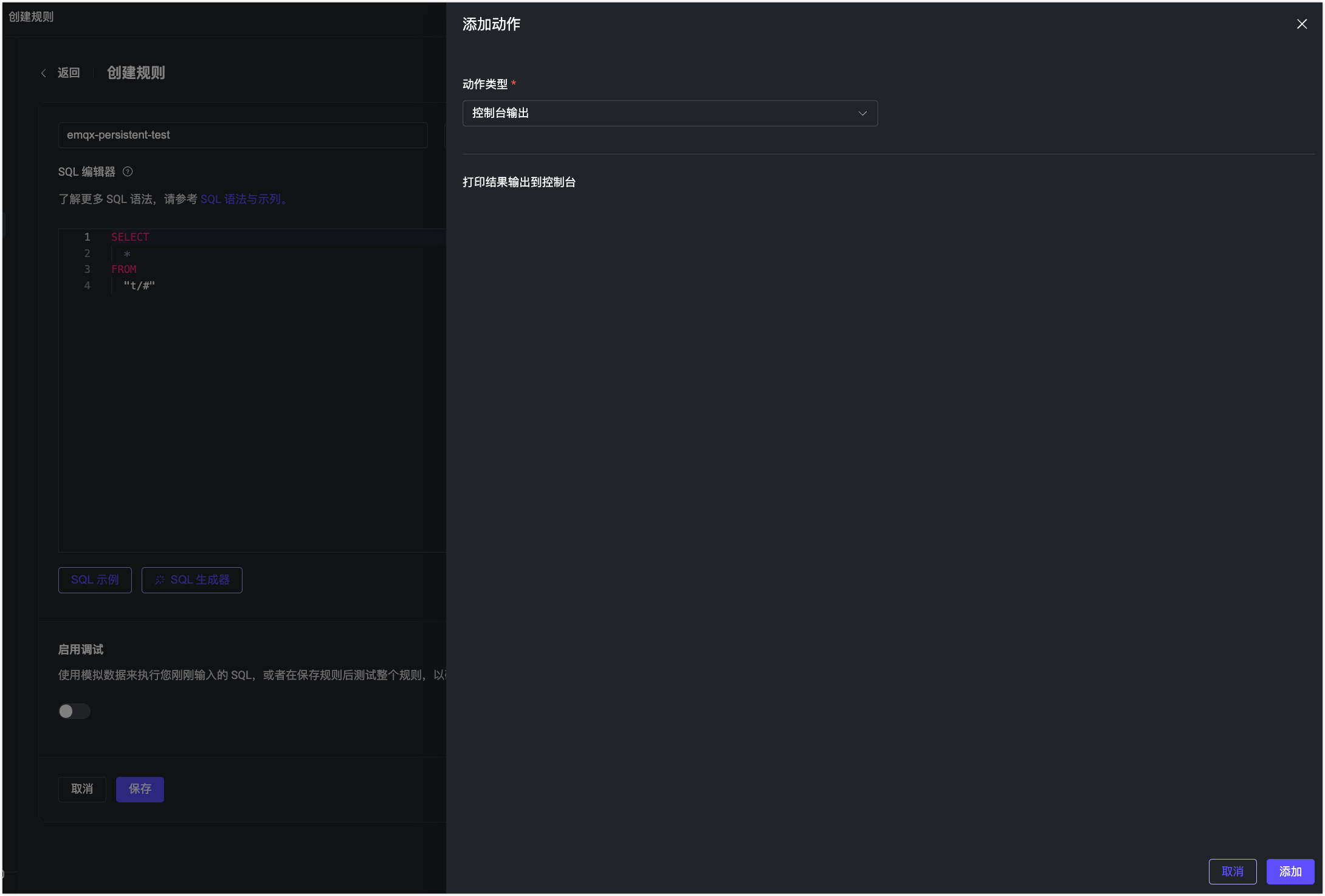 在 EMQX Dashboard 中创建测试规则。