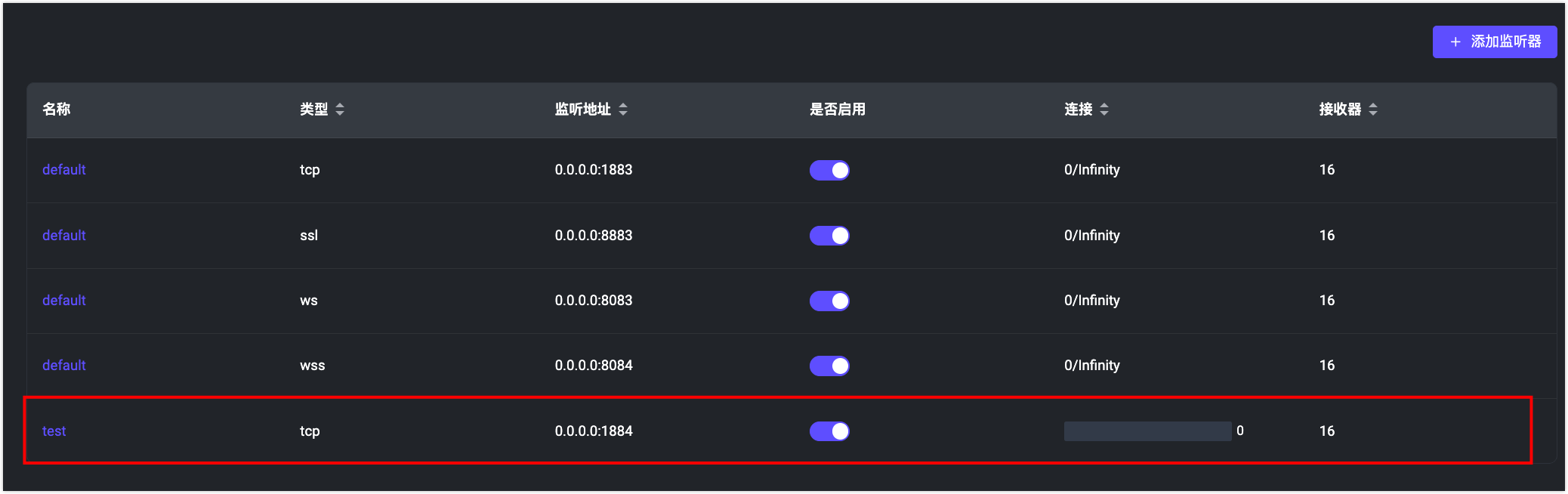 test、端口为1884的监听器,如下图所示: