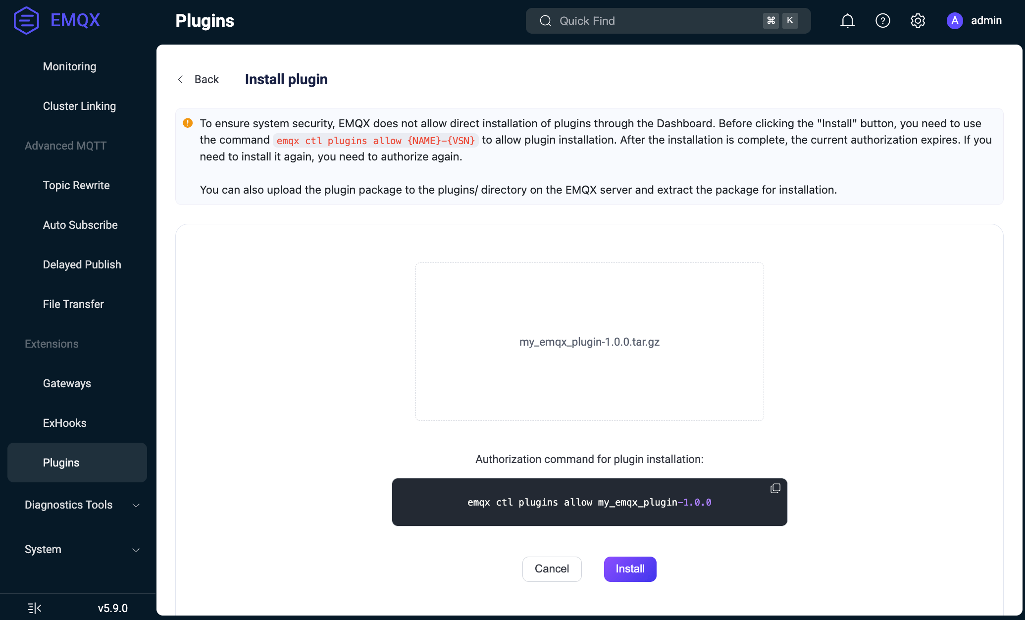 EMQX 支持通过 Dashboard、CLI 和 API 安装、卸载和管理插件包。