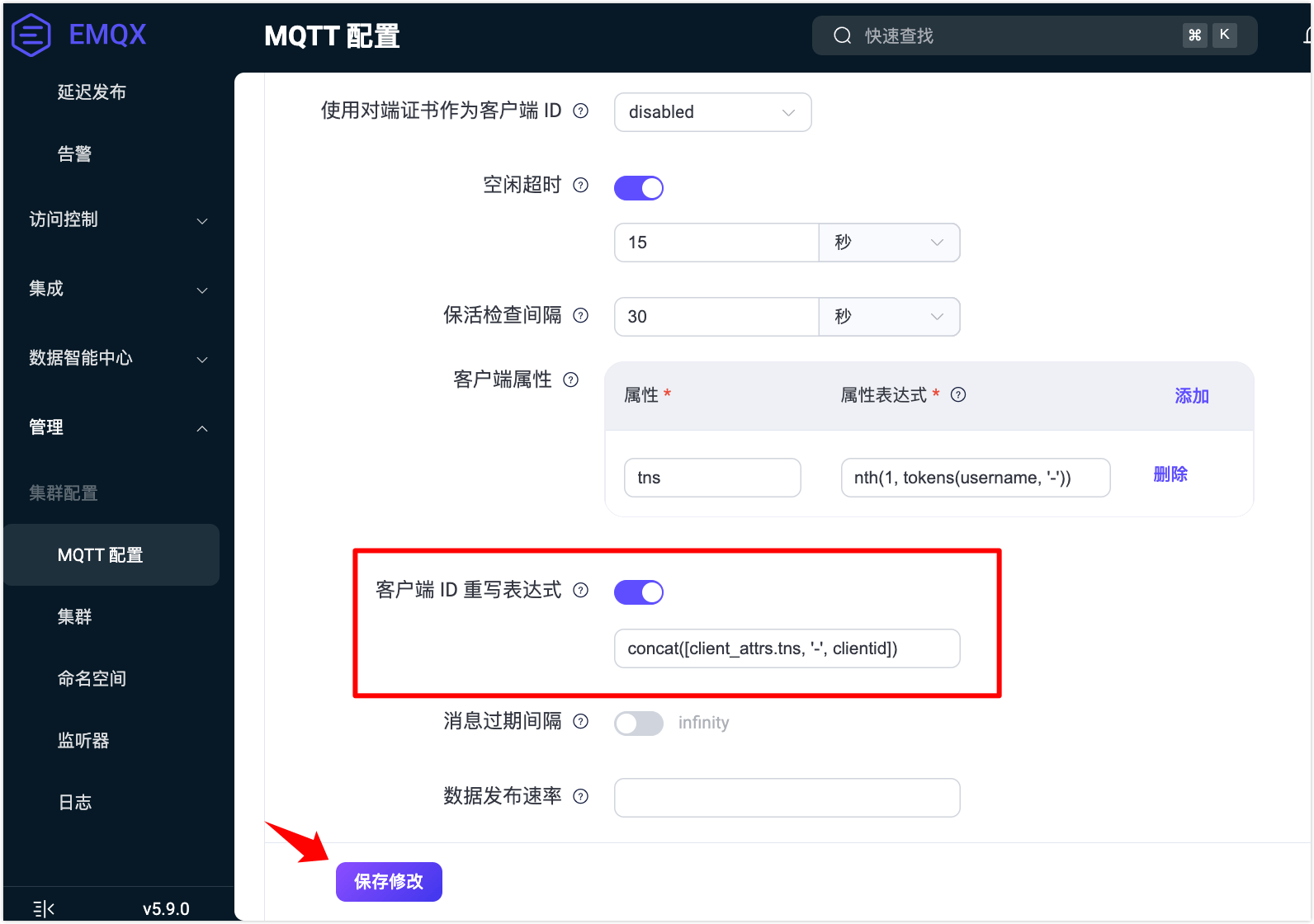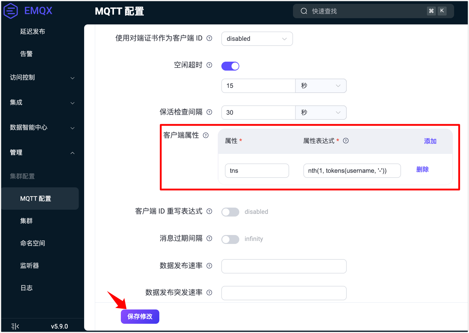 base.hocon中配置客户端属性,从用户名中提取命名空间标识用户识别租户:mqtt.client_attrs_init = [{expression = "nth(1, tokens(username, '-'))", set_as_attr = tns}]示例说明:如果客户端连接时使用的用户名是