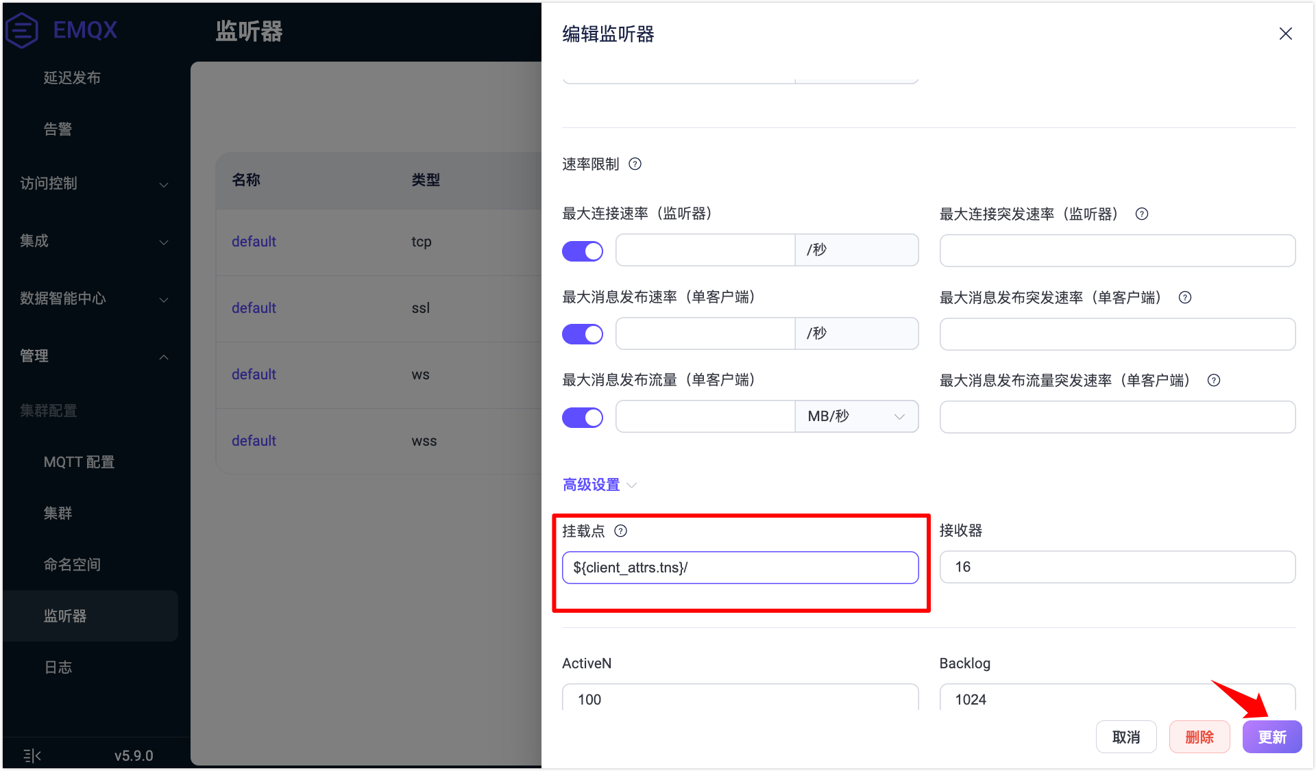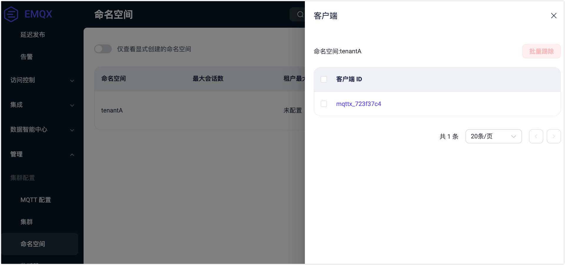 tenantA-user1,EMQX 会将tenantA作为命名空间名(tns)提取出来。或者,您也可以在 Dashboard 中进行设置: