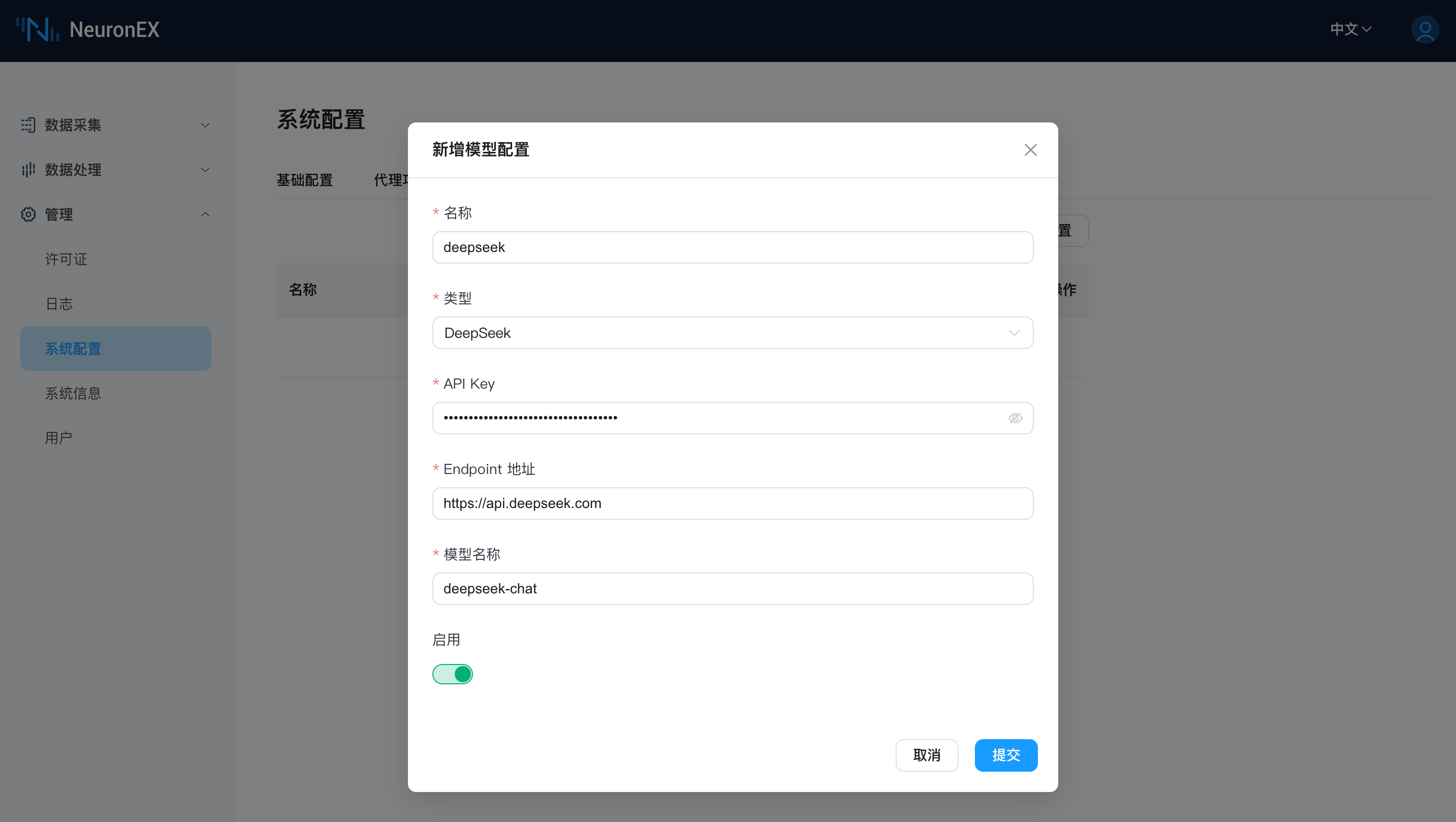 您可通过以上模型厂商的官方网站获取 API Key,并在 NeuronEX 页面添加模型配置并启用。可在页面中同时配置多个大模型,但只能启用一个模型进行使用。
