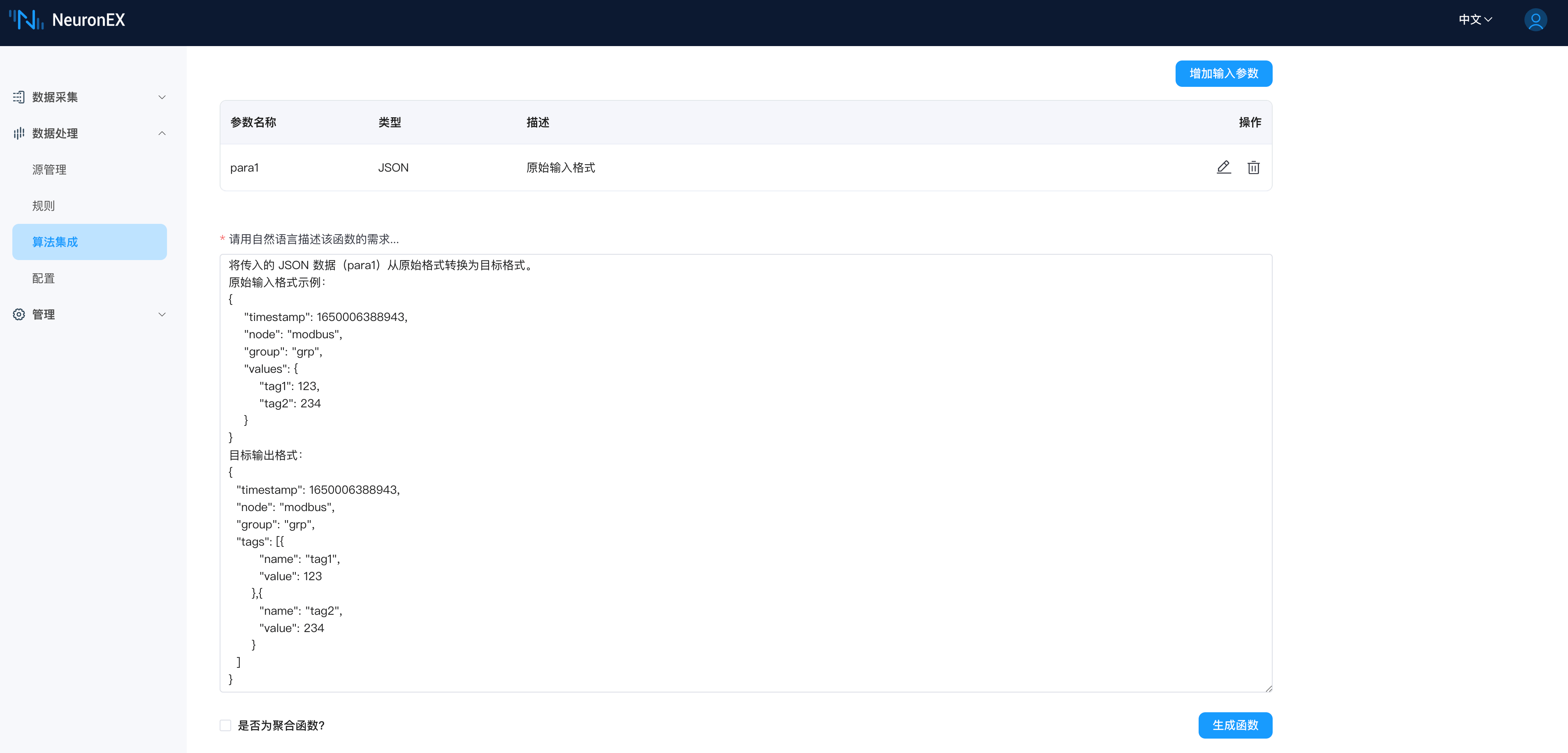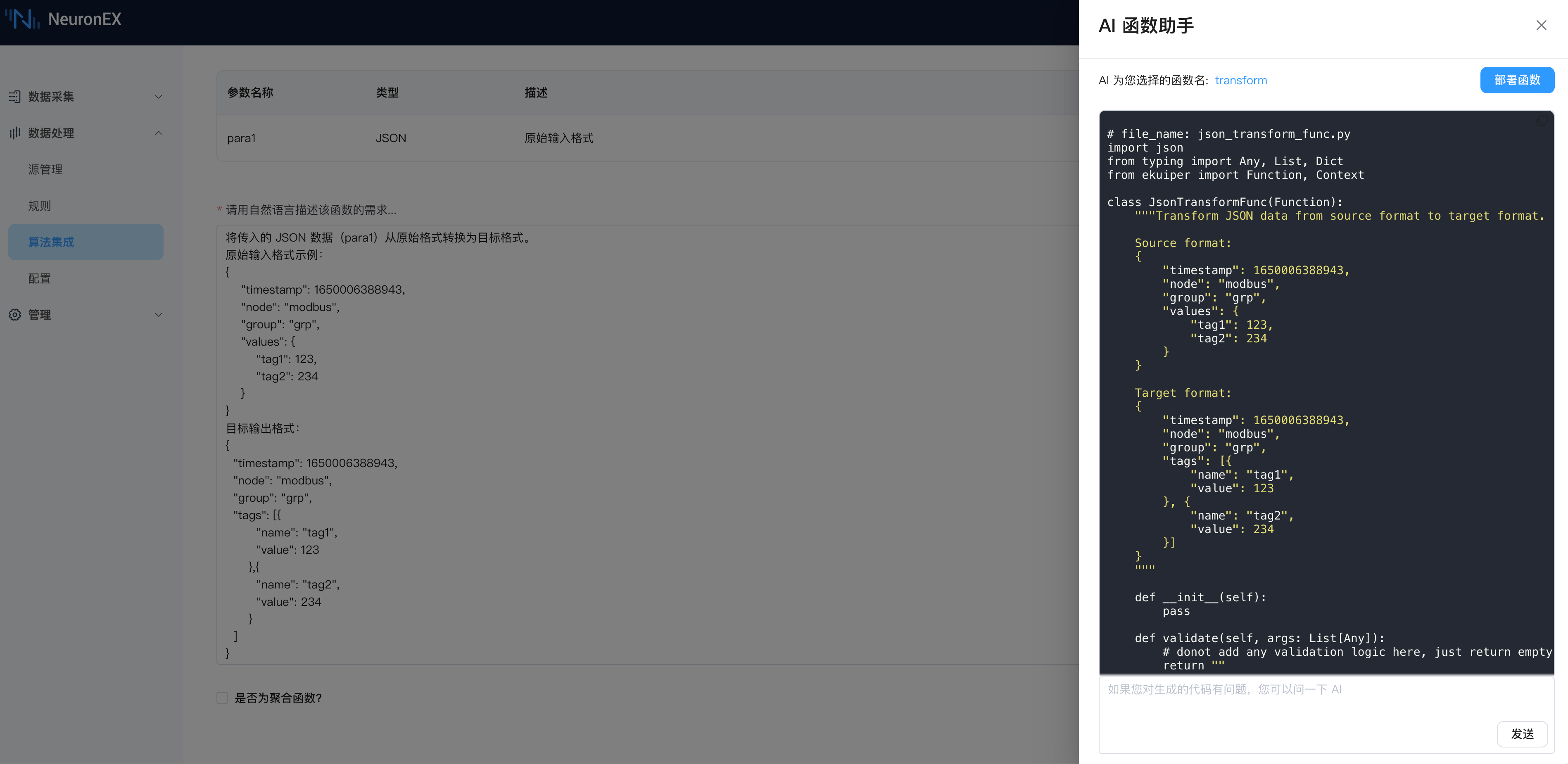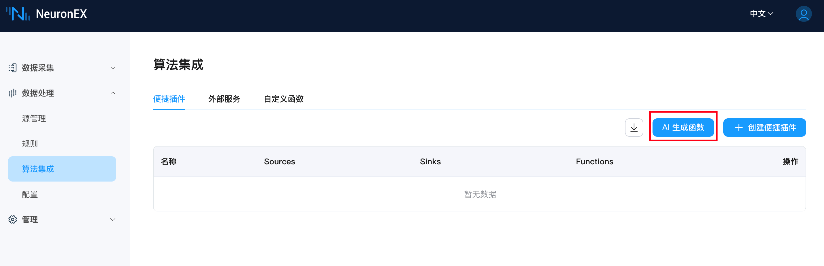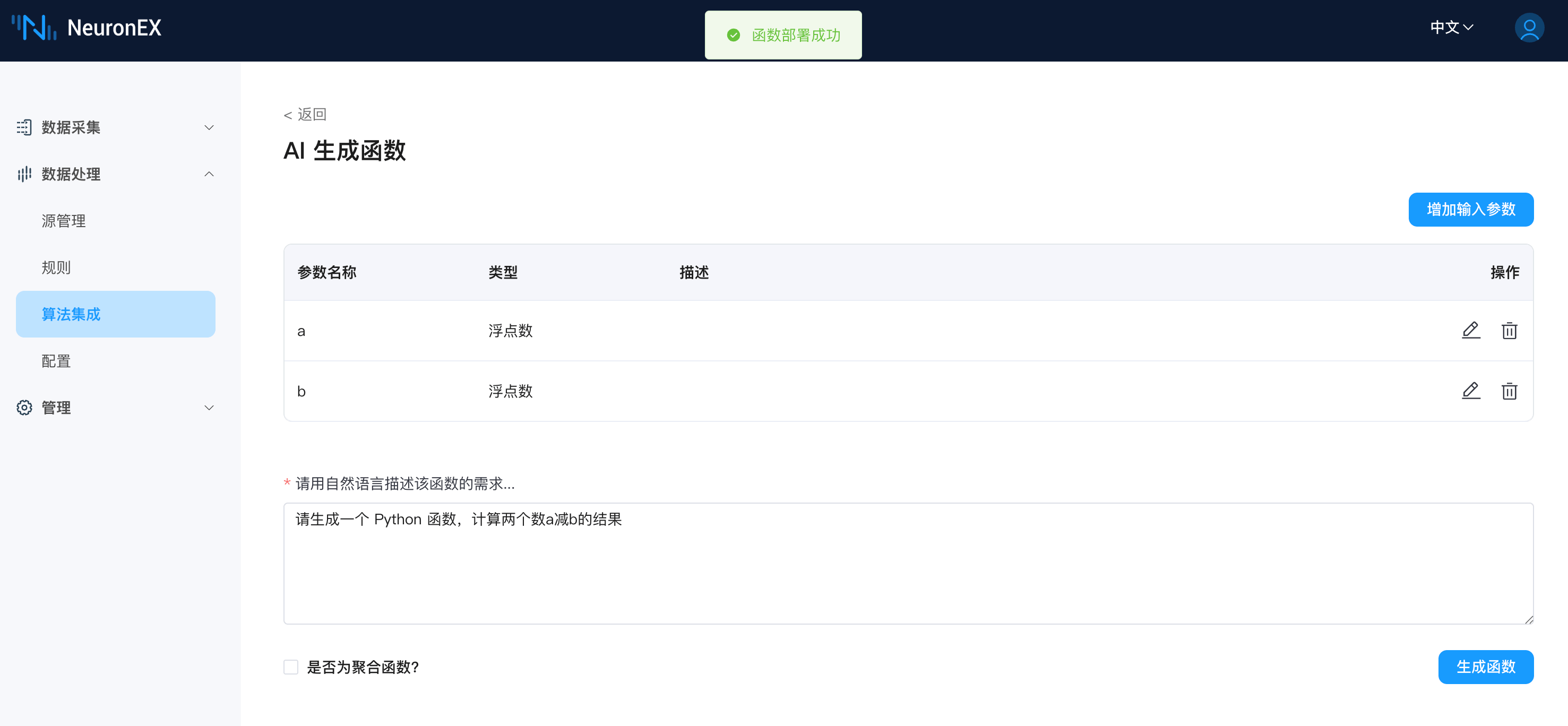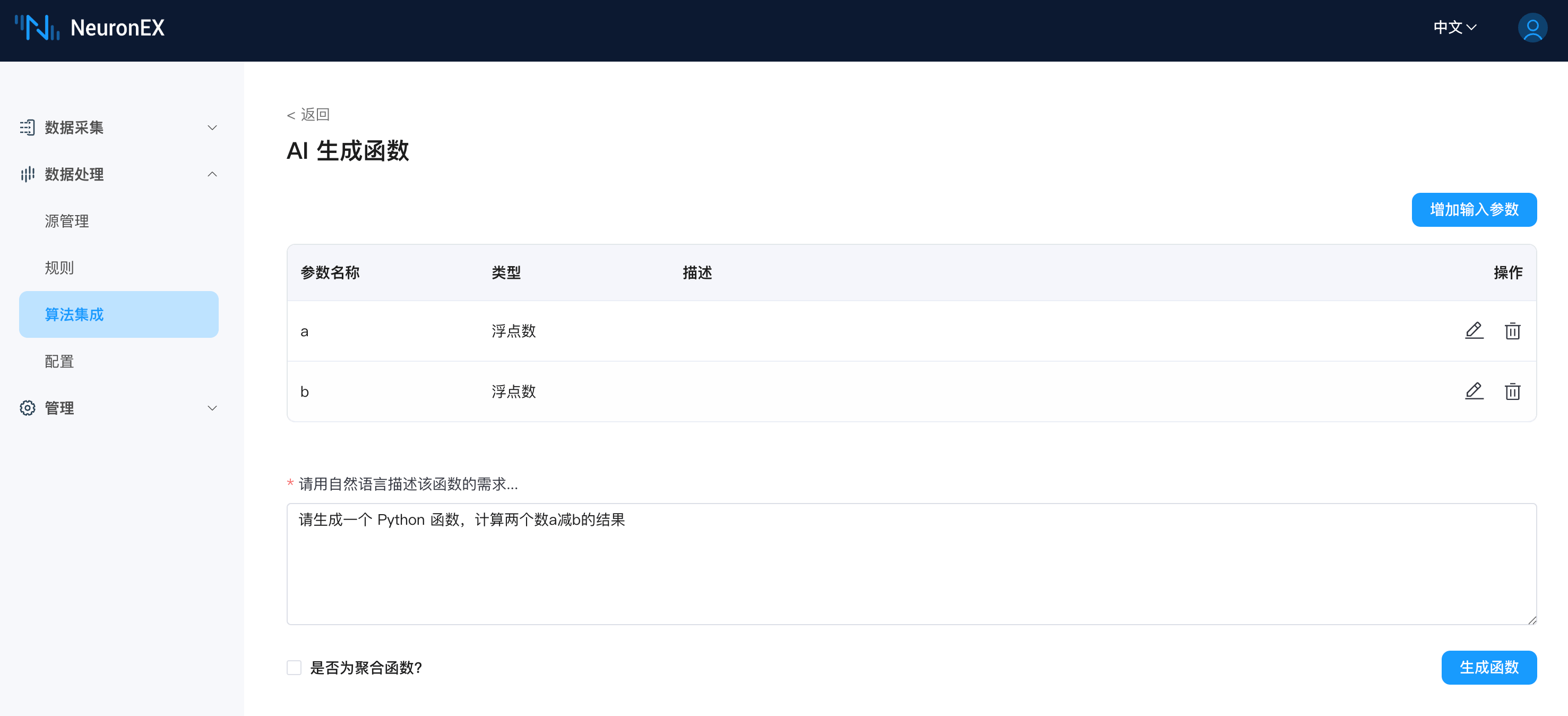 配置好 LLM 模型后,在 NeuronEX 数据处理 -> 算法集成页面,点击AI生成函数,进入AI生成函数页面: