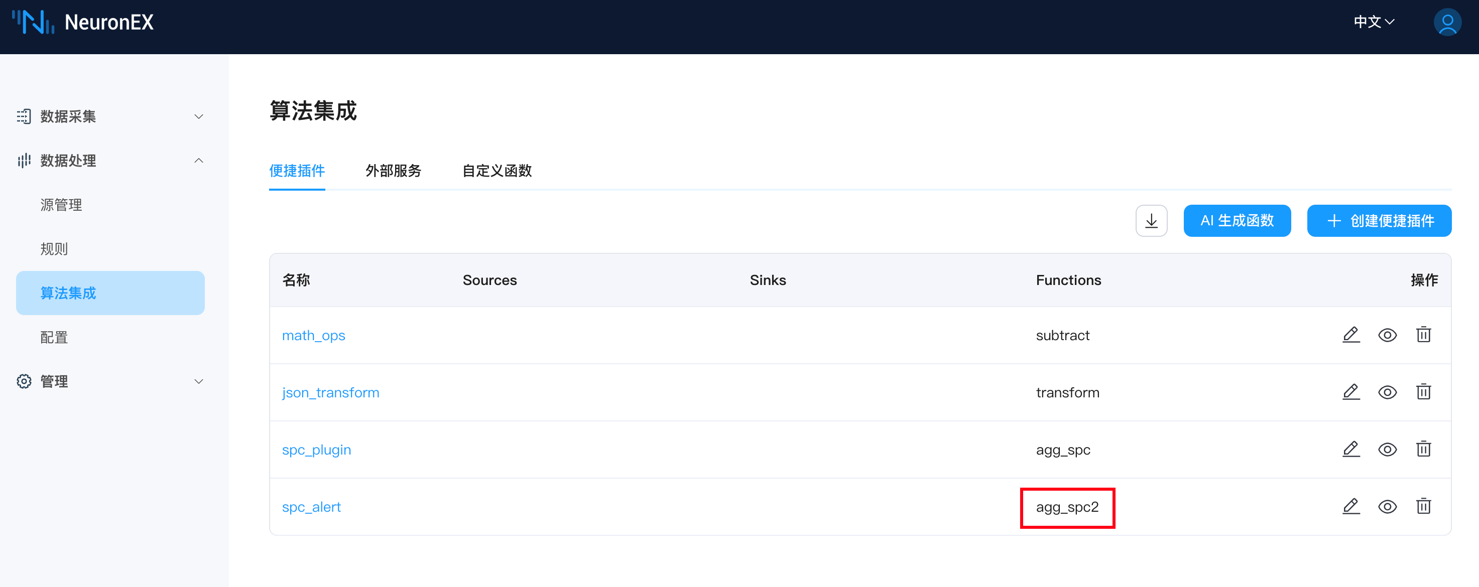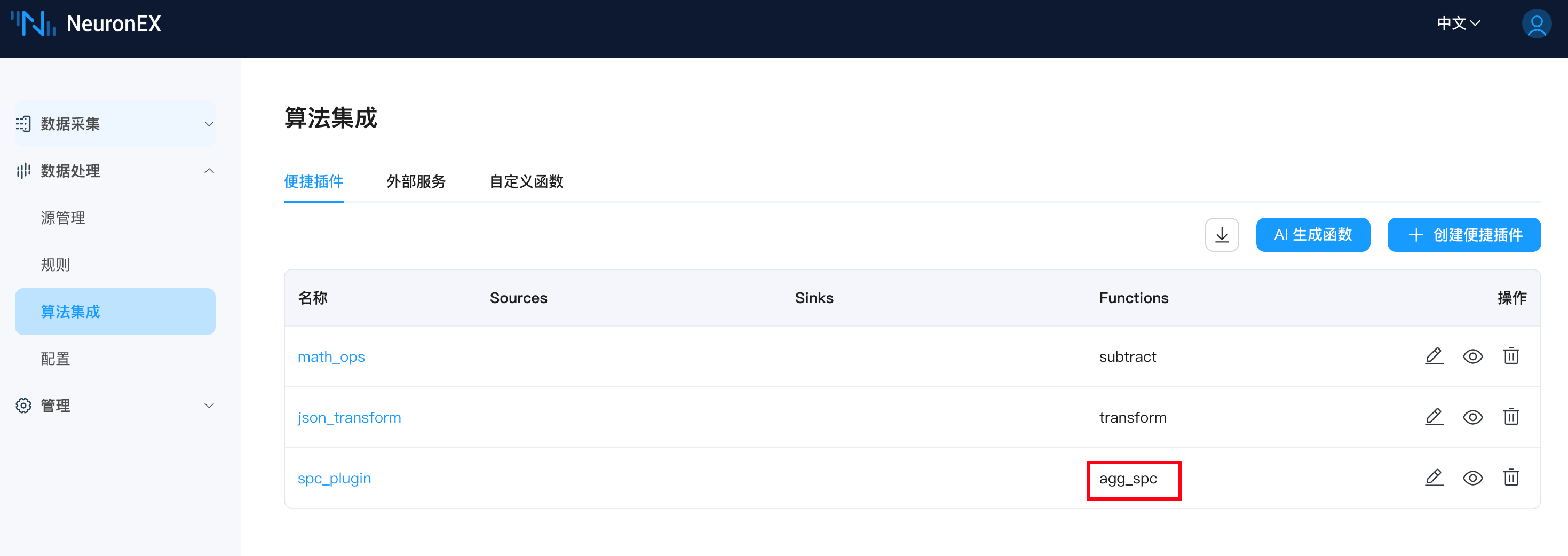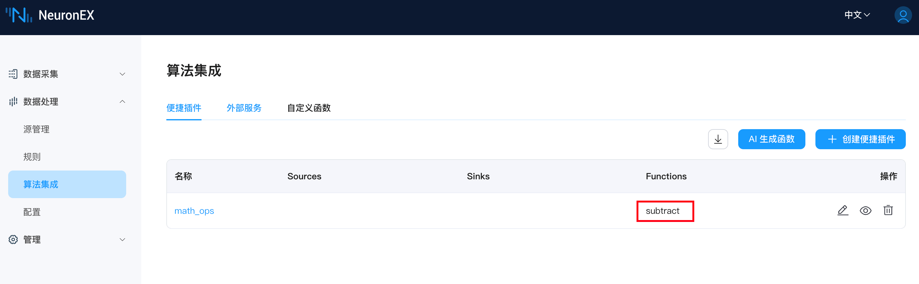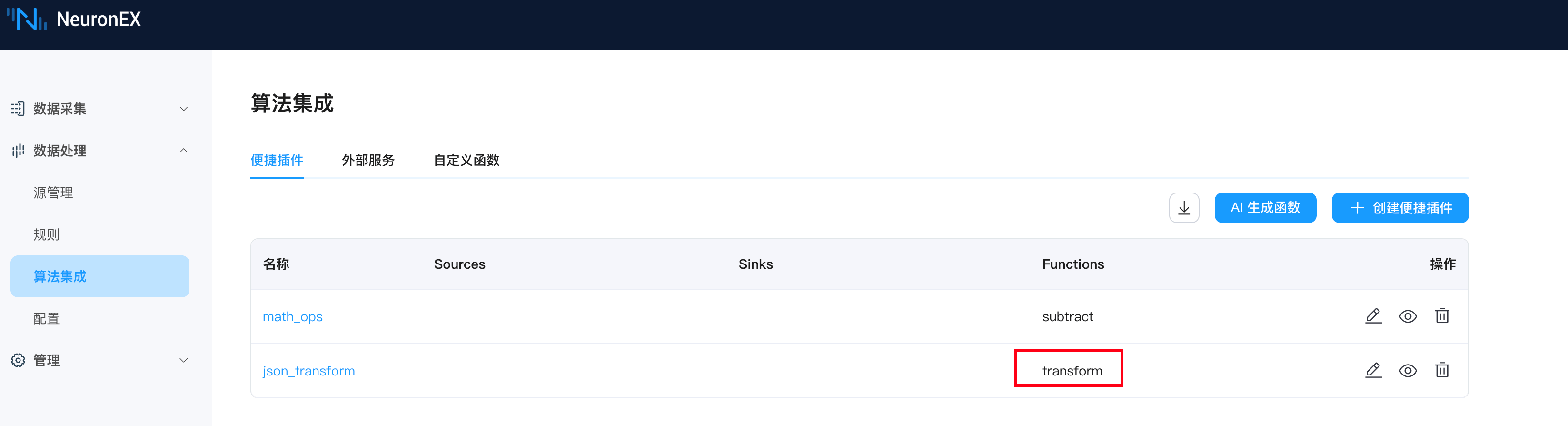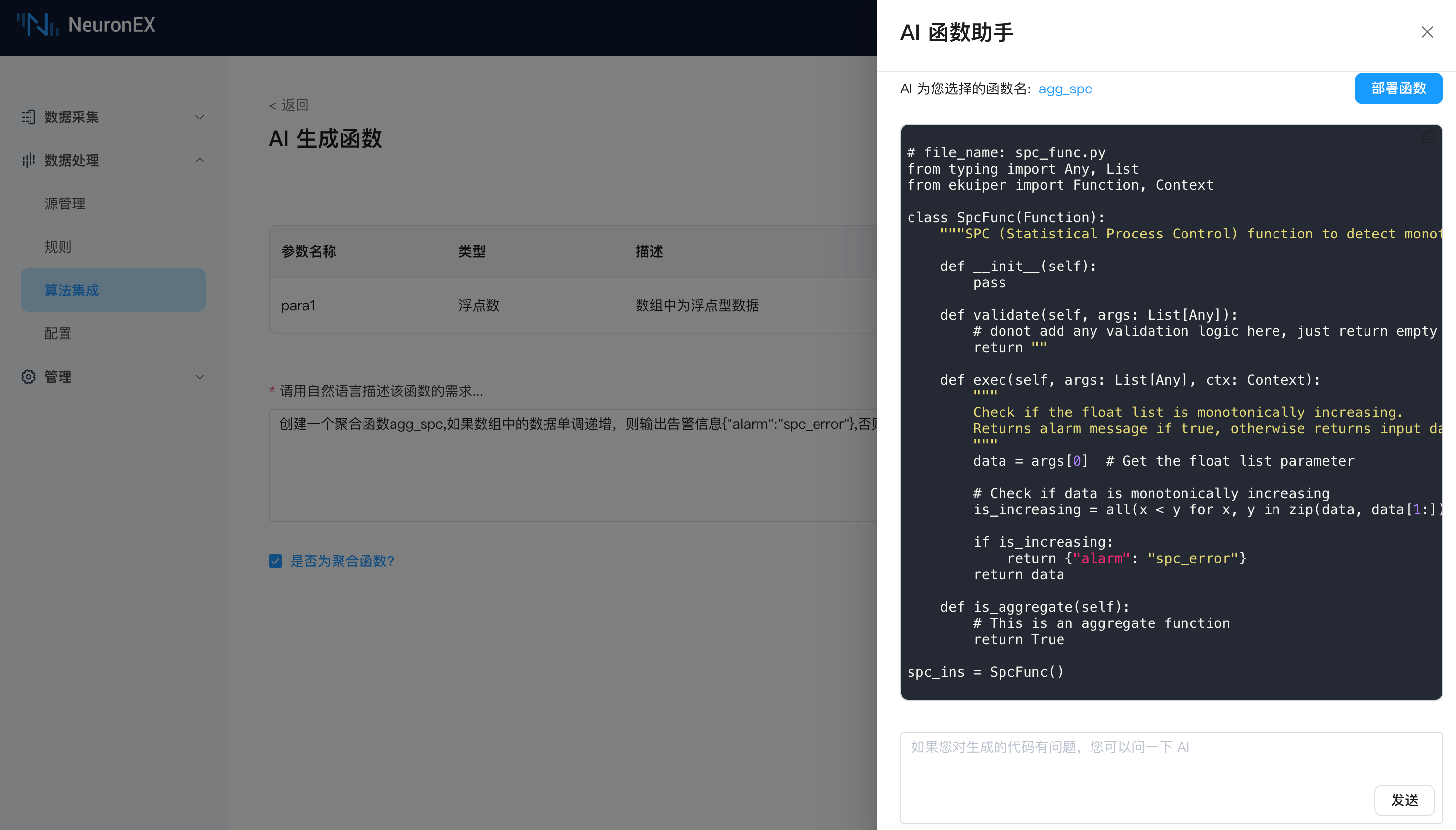 配置好 LLM 模型后,在 NeuronEX 数据处理 -> 算法集成页面,点击AI生成函数,进入AI生成函数页面: