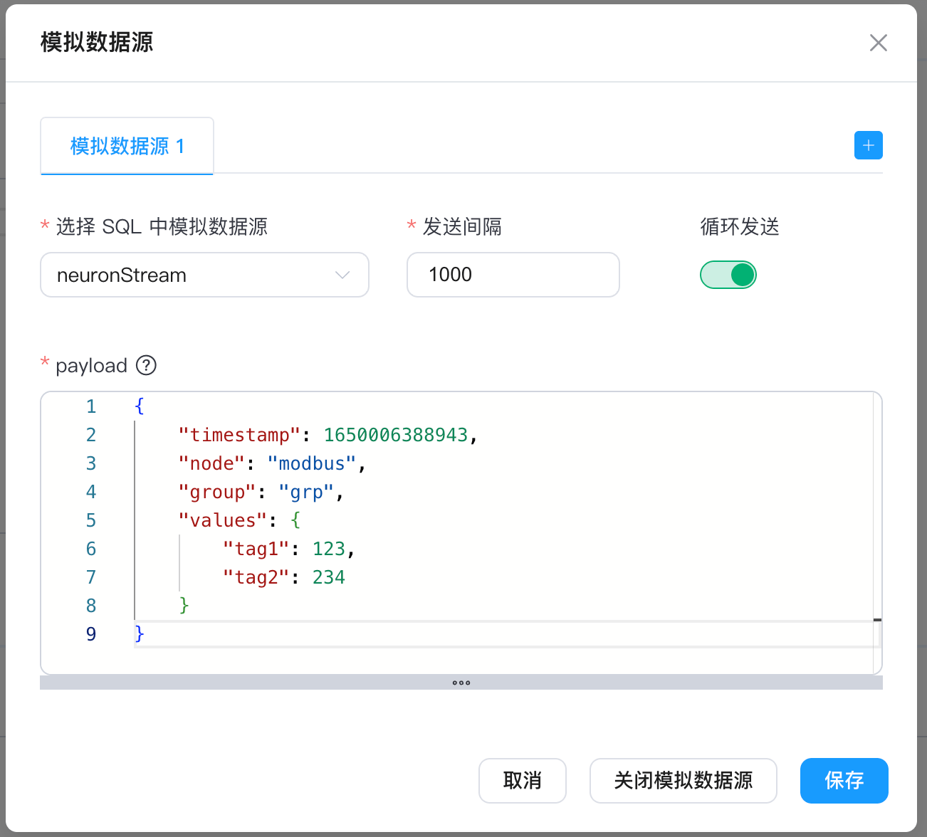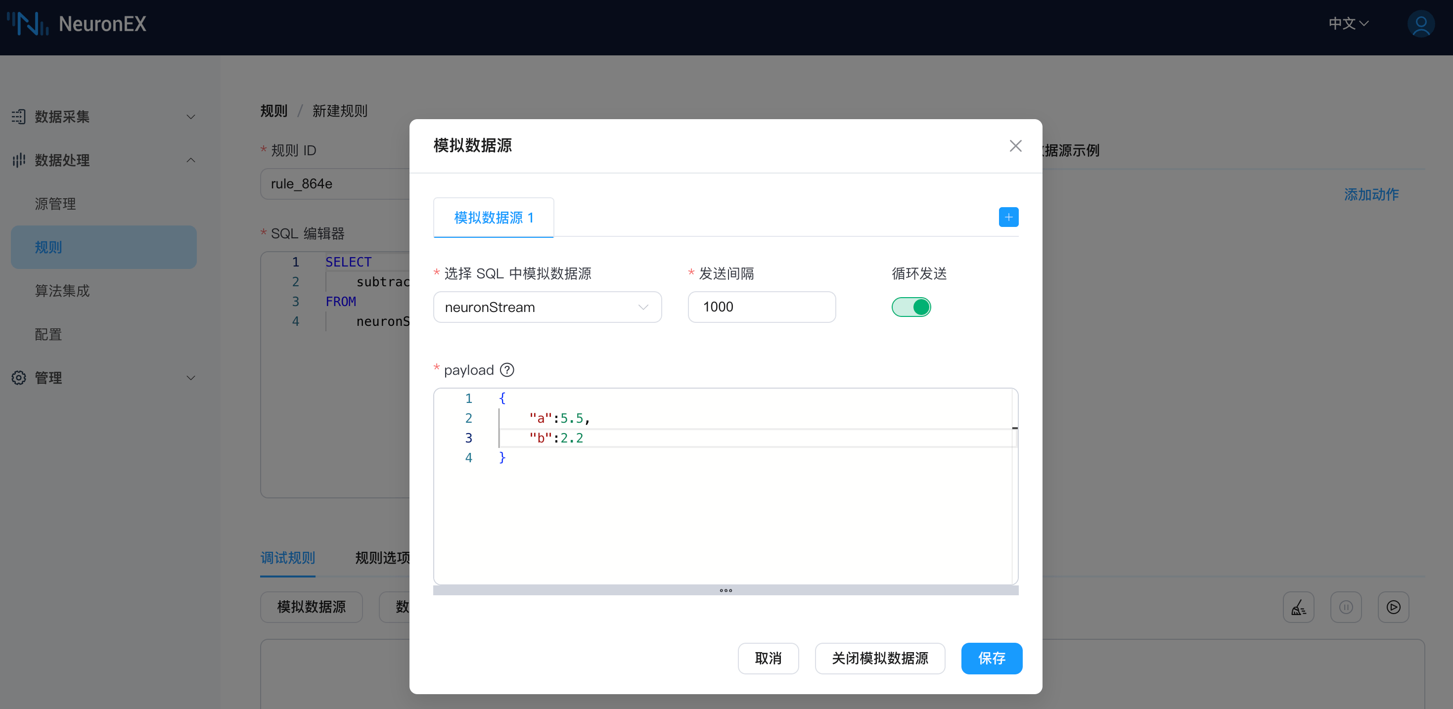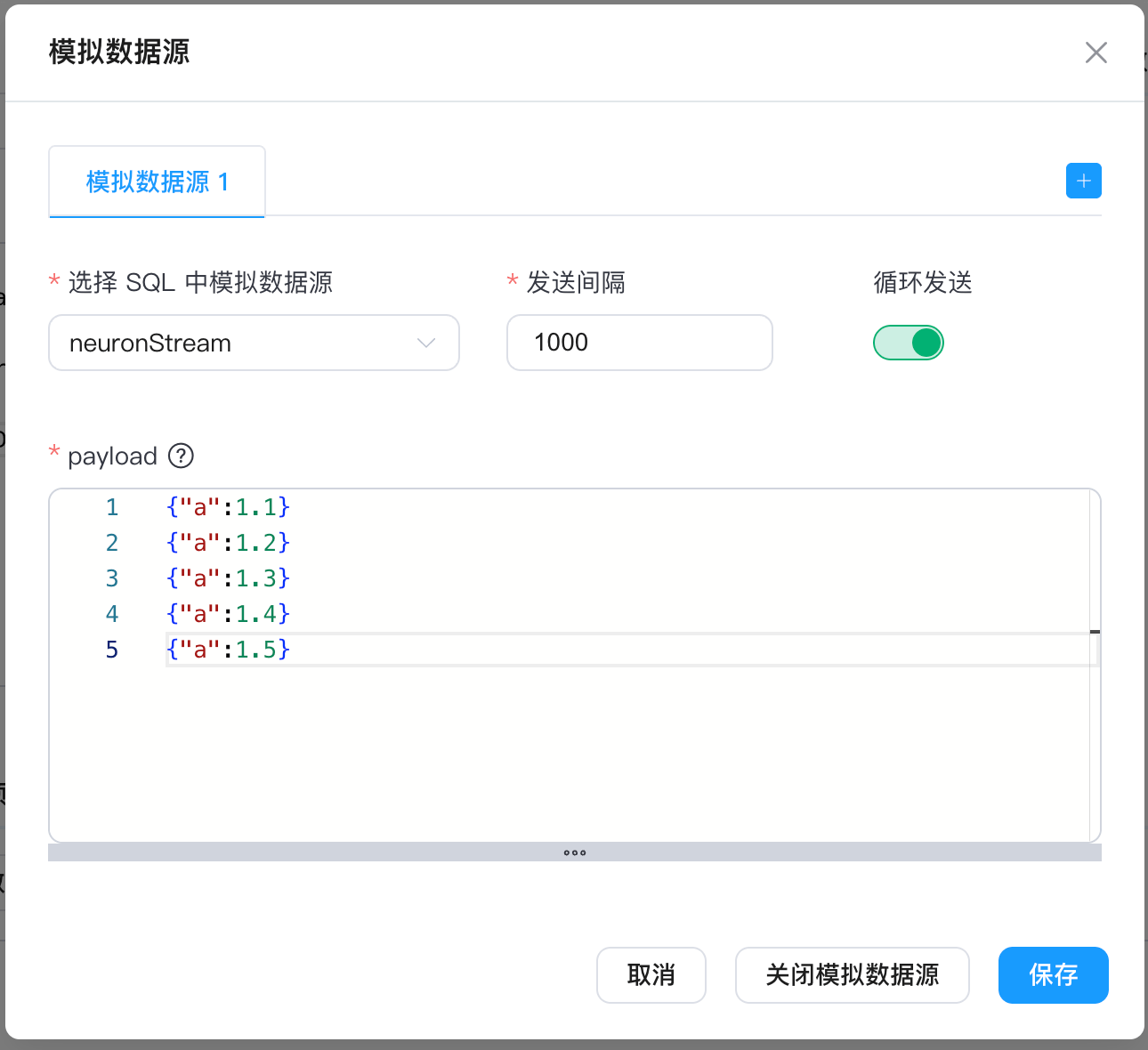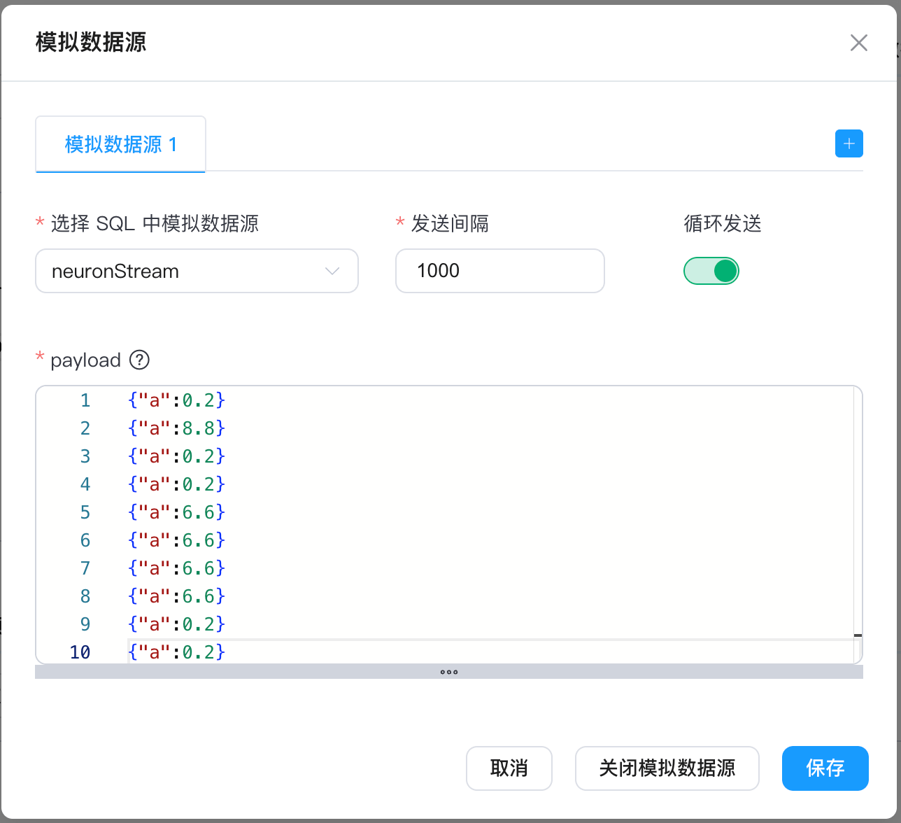 点击模拟数据源按钮,在弹出的模拟数据源页面,选择 SQL 中模拟数据源为neuronStream,payload内容设置如下,点击保存按钮。