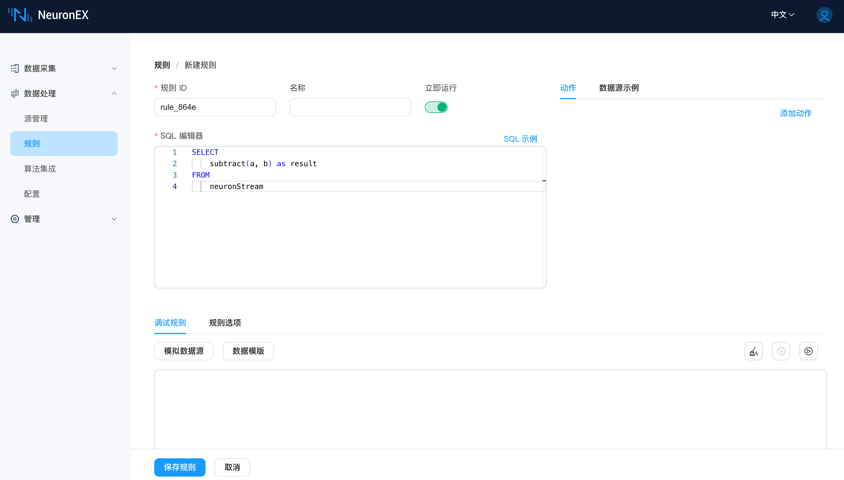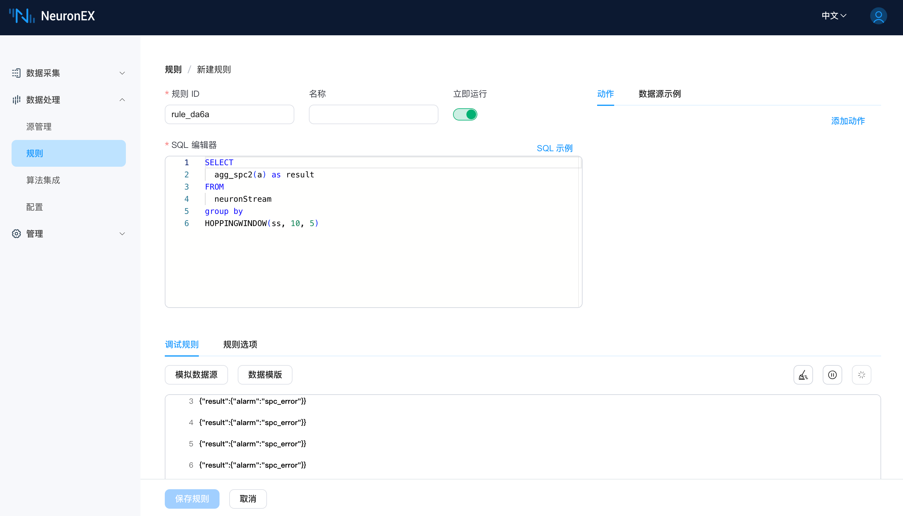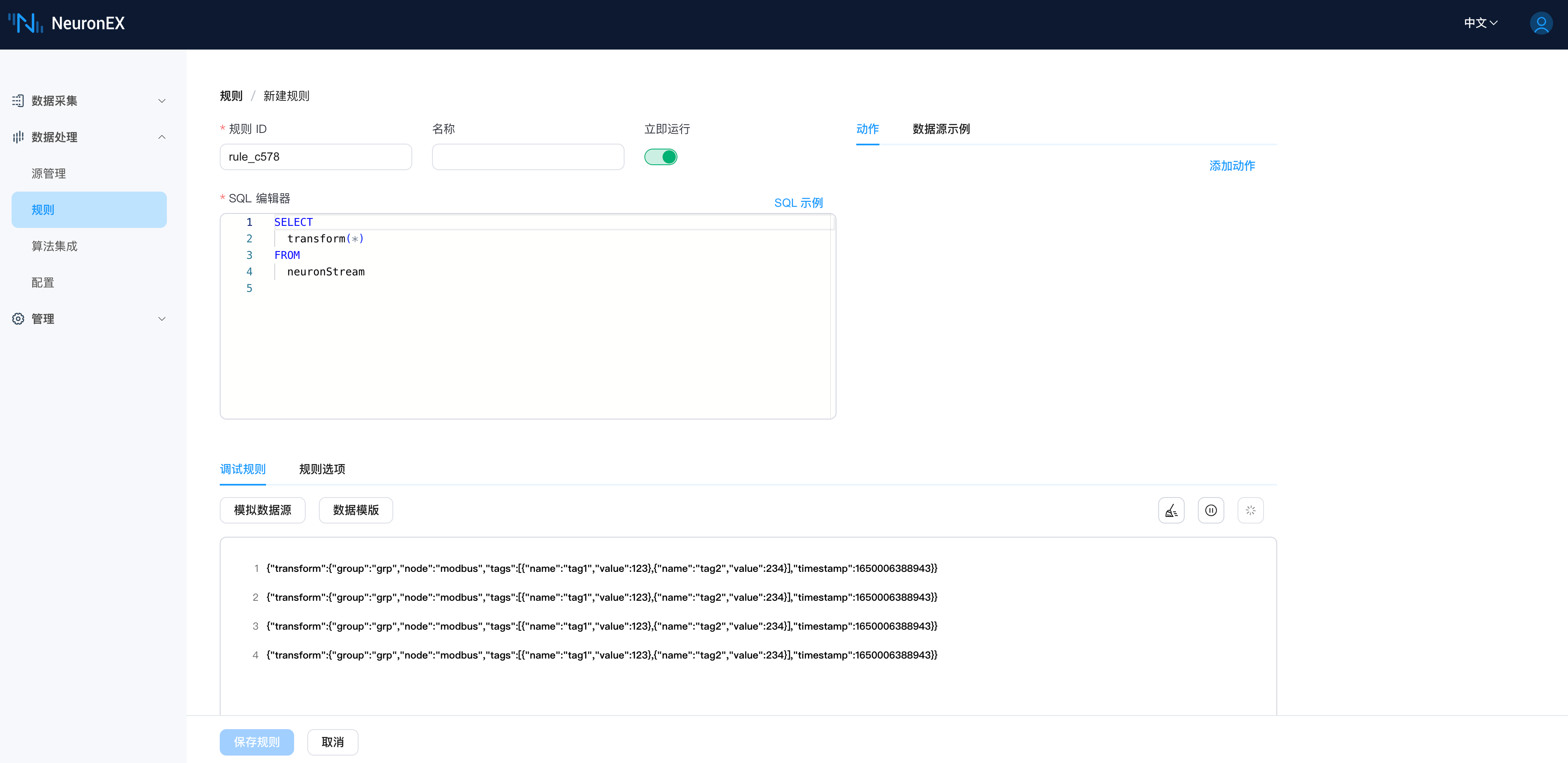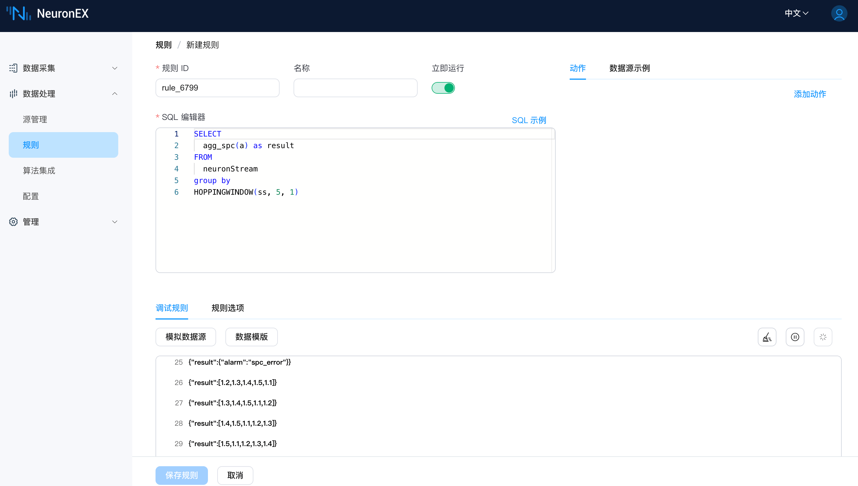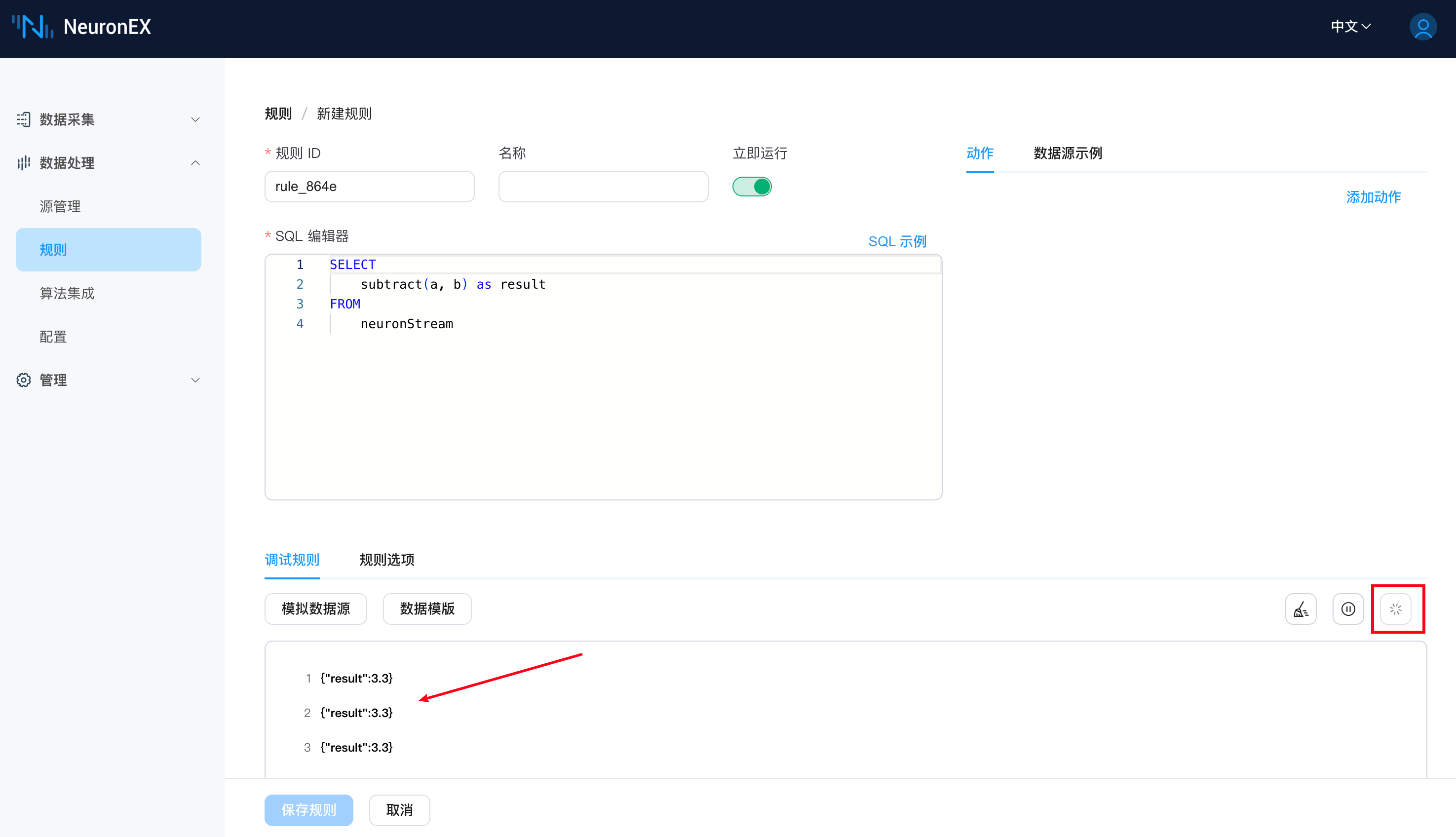 在数据处理 -> 规则页面,点击新建规则按钮,进入新建规则页面,在 SQL 语句中调用生成的便捷插件,并测试使用。
