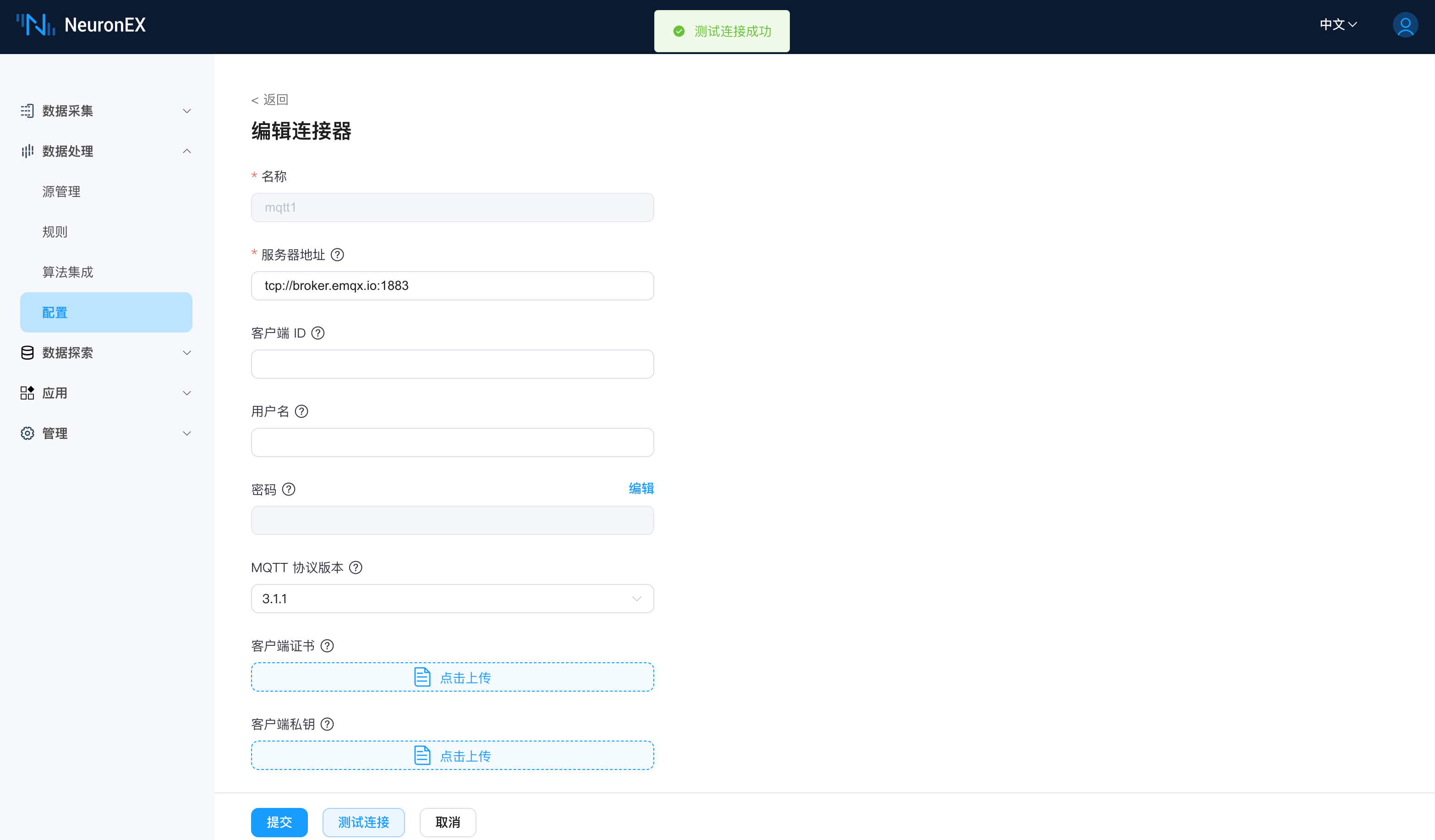 首先我们需要先创建一个 MQTT 连接器,在 NeuronEX 的数据处理->配置 页面,创建连接器,选择 MQTT 连接器,填写以下信息: