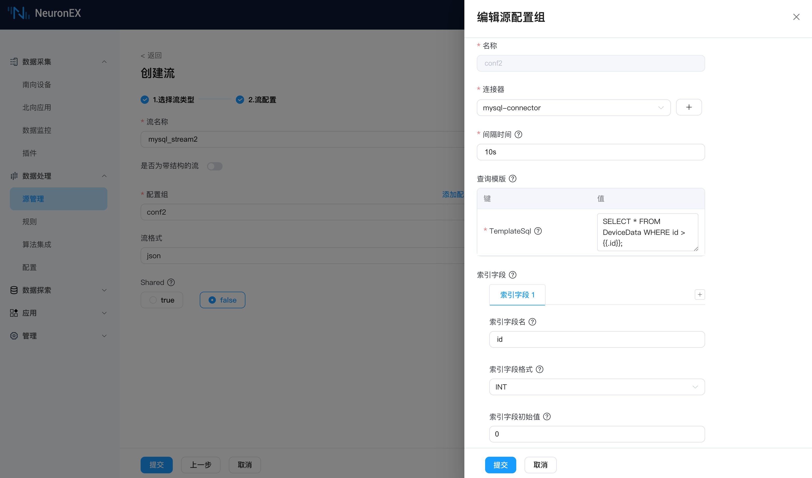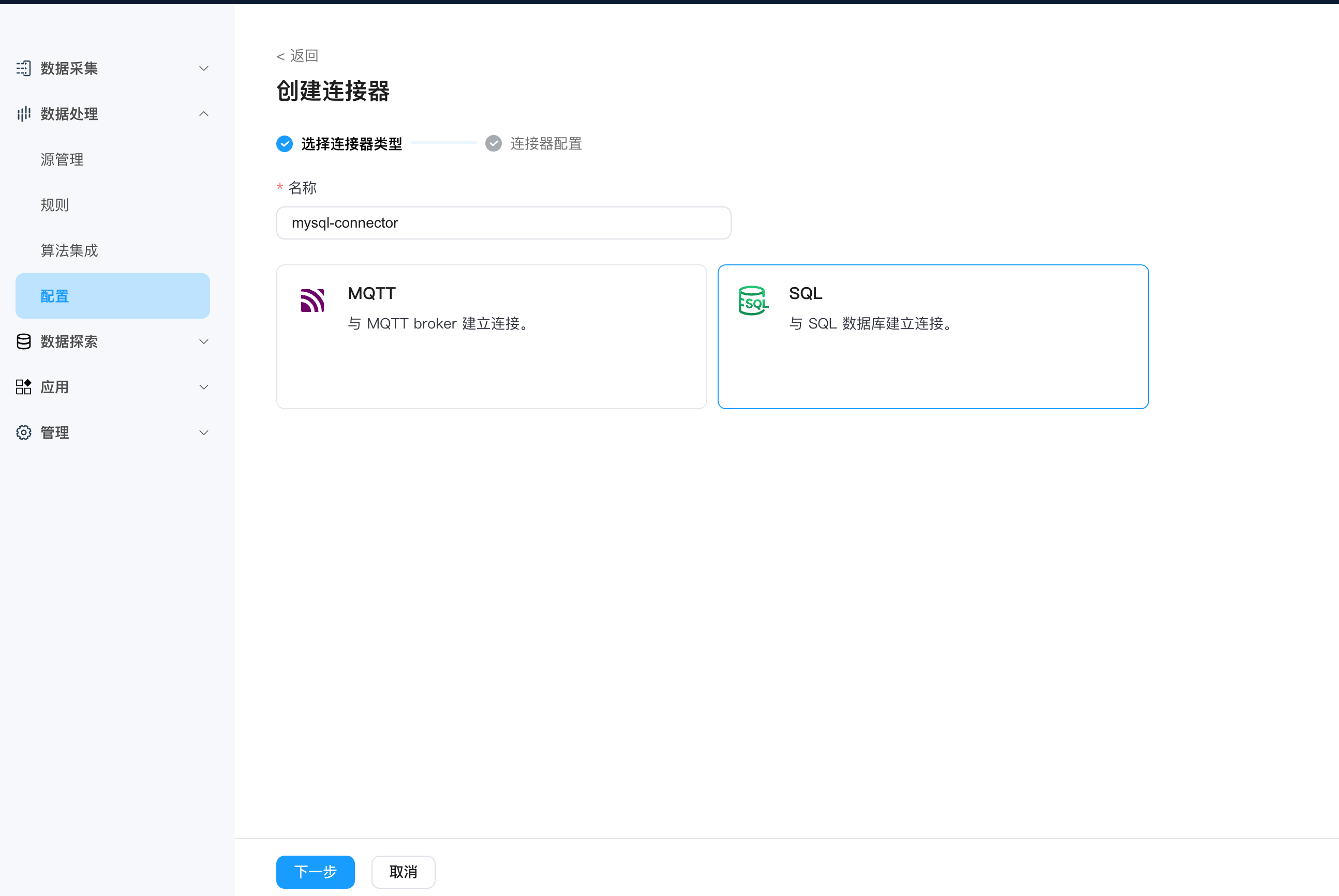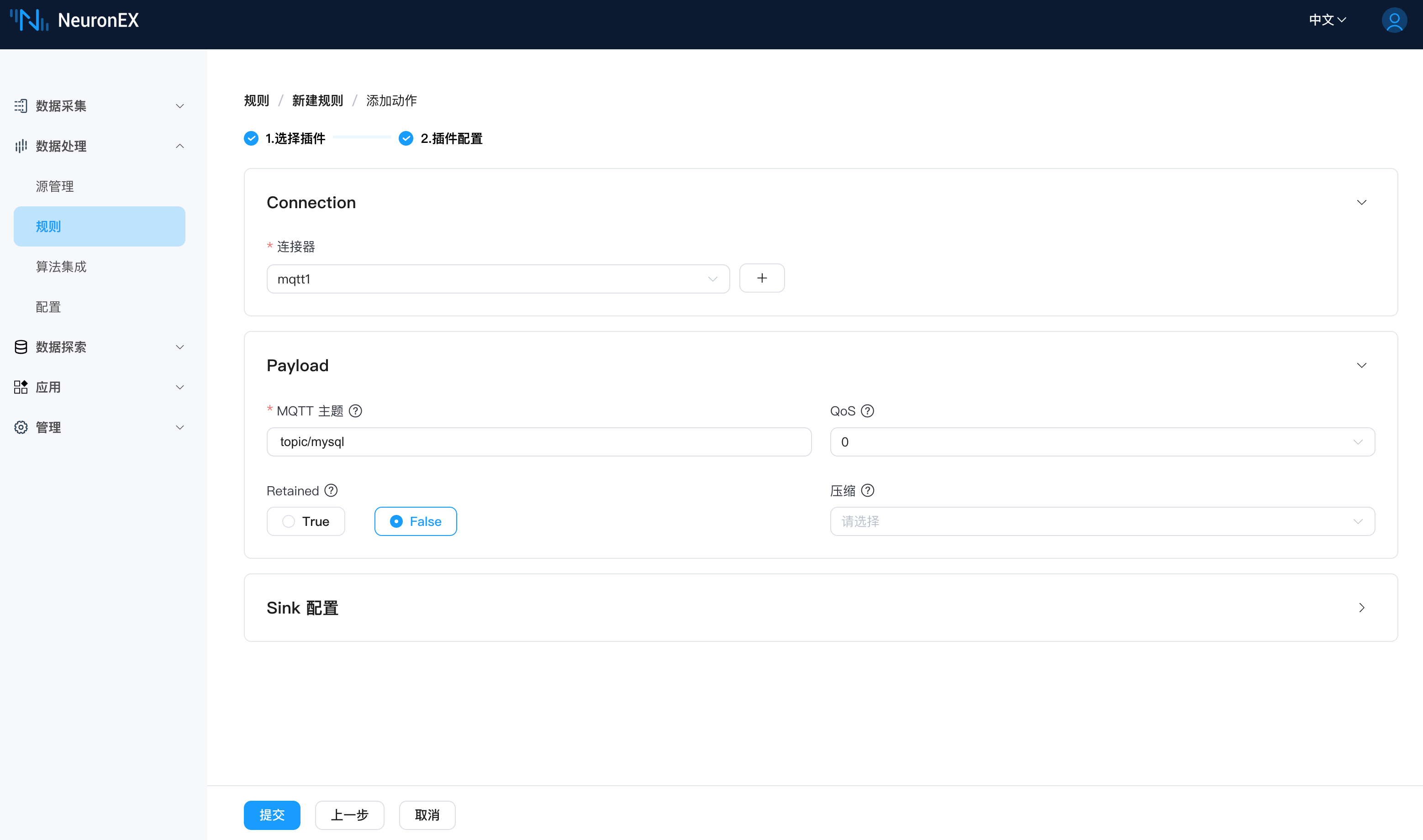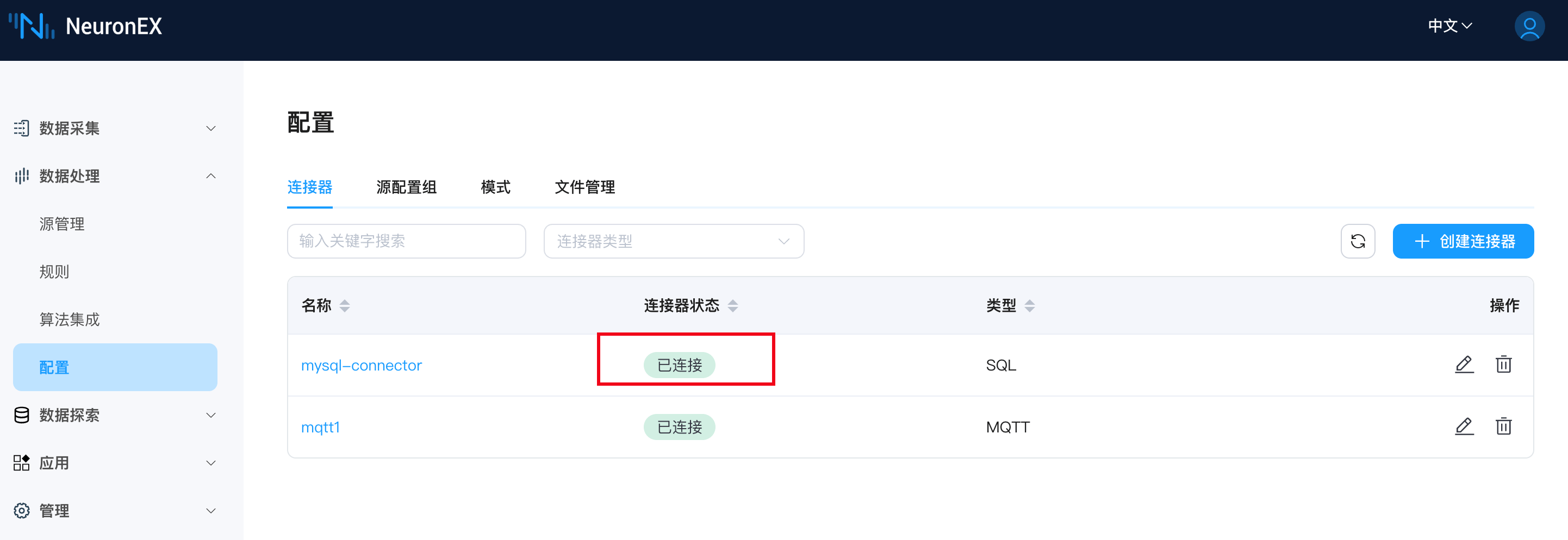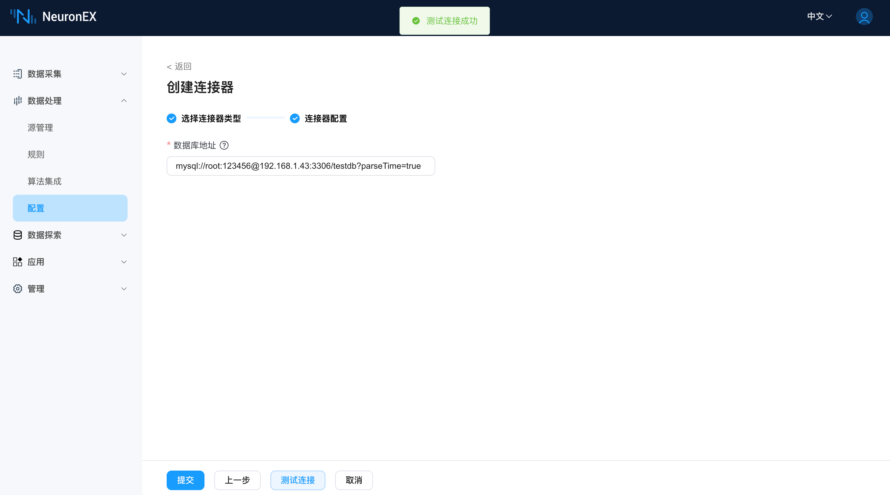 首先在 NeuronEX 的数据处理->配置 页面,创建连接器,选择 MySQL 连接器,填写以下信息: