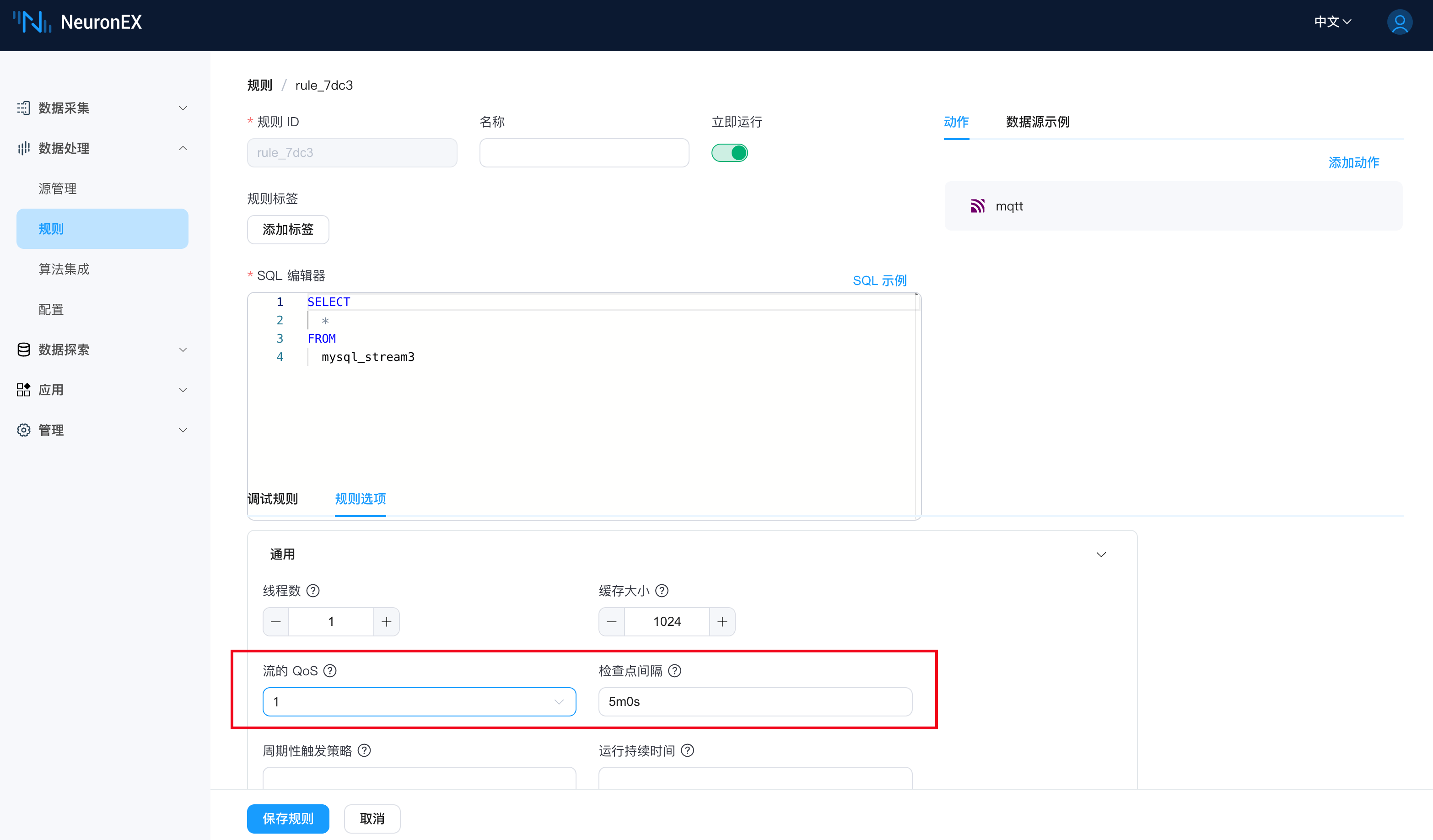 我们可以在规则页面,通过配置规则选项中的流的 QoS和检查点间隔,可以保存数据库数据增量拉取功能的索引字段名,以此来实现当规则被手动停止或者NeuronEX服务异常停止的情况下,规则可以自动恢复,继续从上一次记录的索引值开始拉取数据。