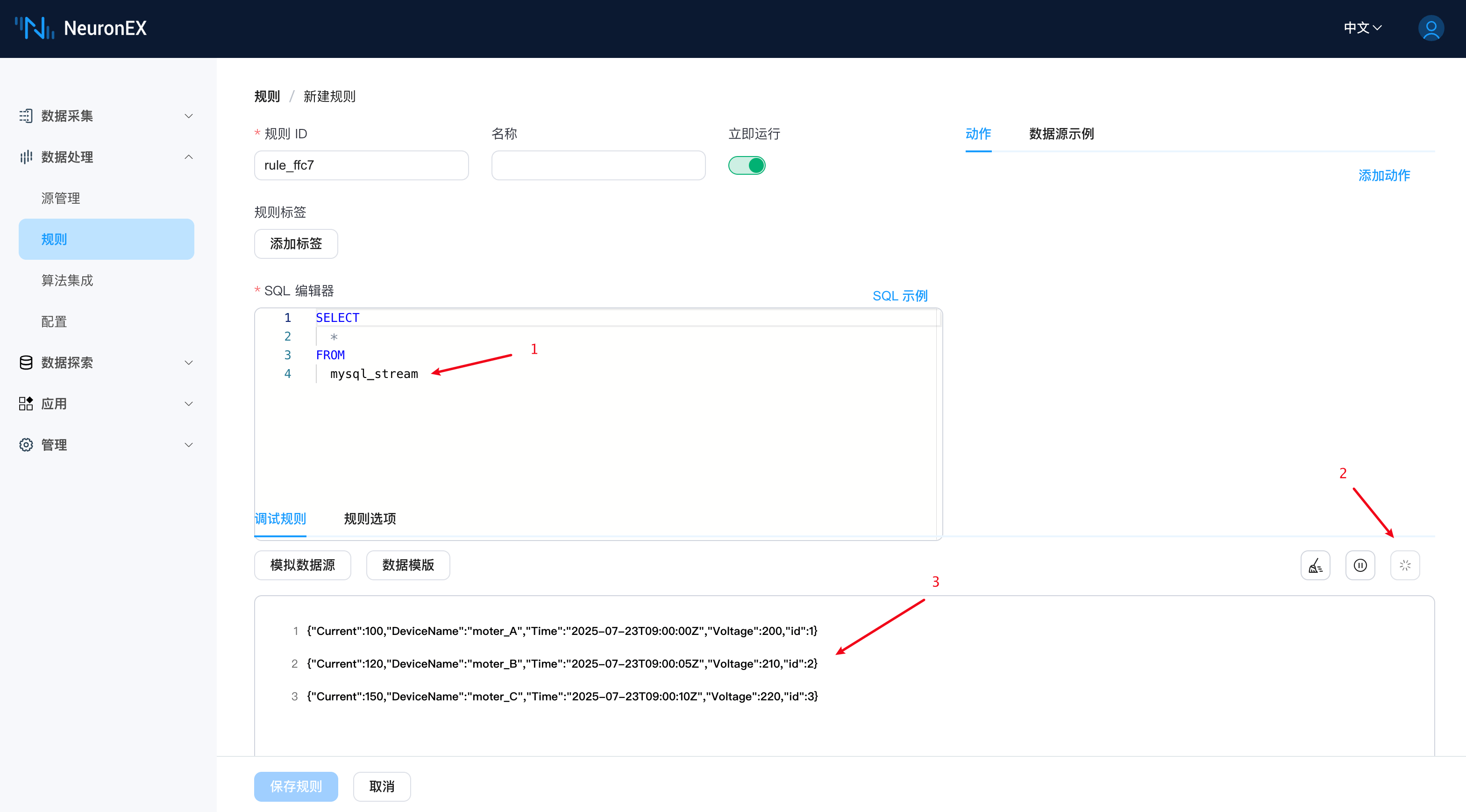 INSERT INTO DeviceData (Time, DeviceName, Current, Voltage) VALUES ('2025-07-23 09:00:15', 'moter_A', 150, 220);此时在规则调试页面,可以看到 NeuronEX 拉取到了这条新数据。(在上一步骤中,不需要停止规则调试)