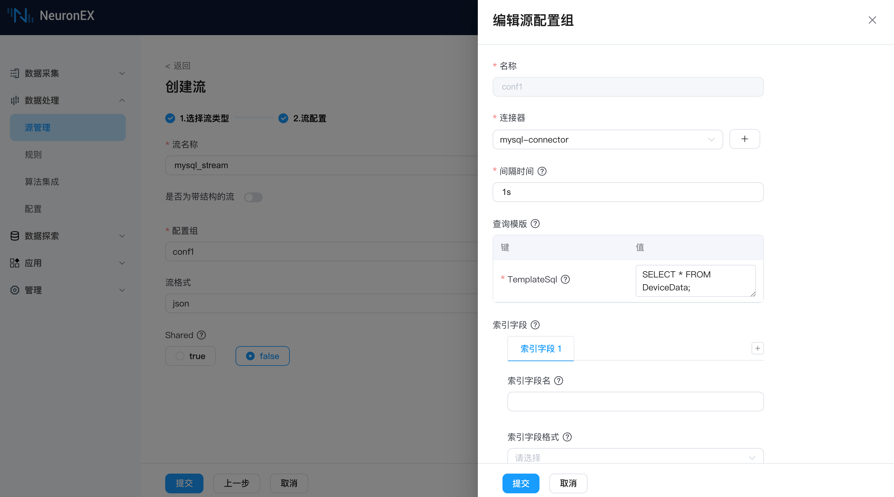 接下来我们通过这个连接器来创建数据源。在 NeuronEX 的数据处理->源管理 页面,点击 创建流,选择 SQL 类型数据源,填写以下信息: