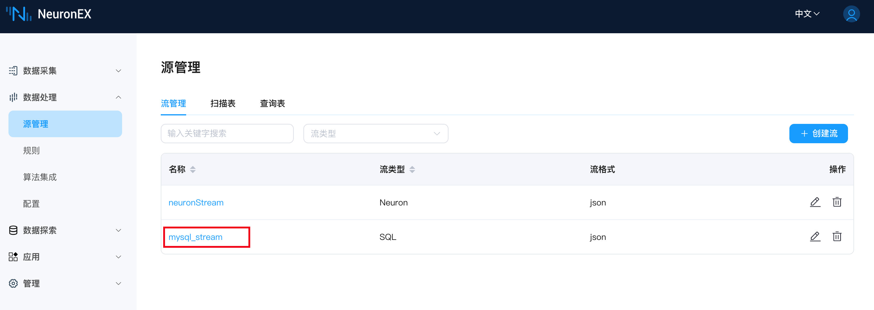 创建成功后,在源管理页面可以看到刚创建的 mysql_stream。
